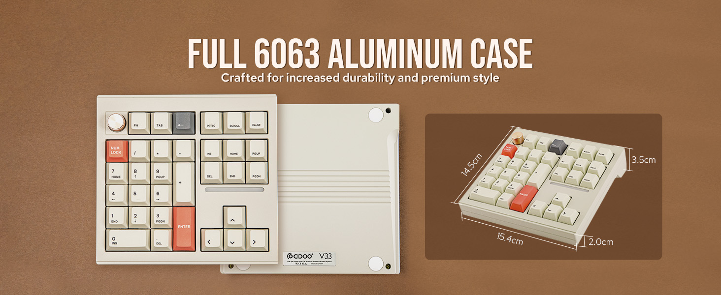 • 【بناء قوي مع علبة ألومنيوم 6063 】 مصنوع من علبة ألومنيوم 6063 كاملة، يوفر CIDOO V33 متانة متزايدة ومظهرًا وملمسًا ممتازًا مقارنة بالجرابات البلاستيكية. يُعرف طلاء المسحوق بمتانته وملمسه ومقاومته للتآكل والصدأ، مما يضمن احتفاظ لوحة المفاتيح بحالتها الأصلية لسنوات.