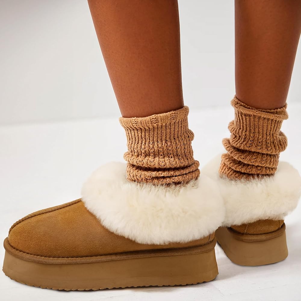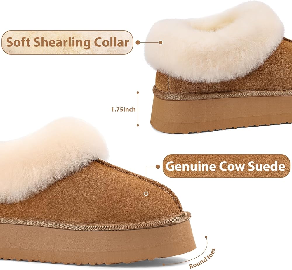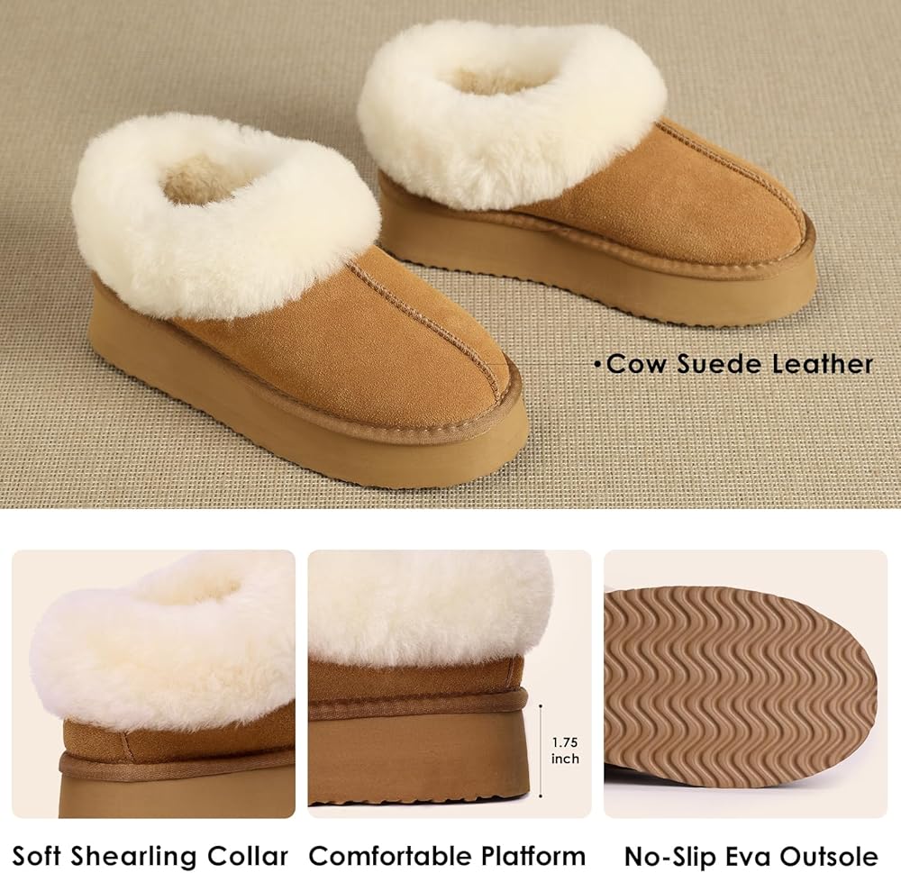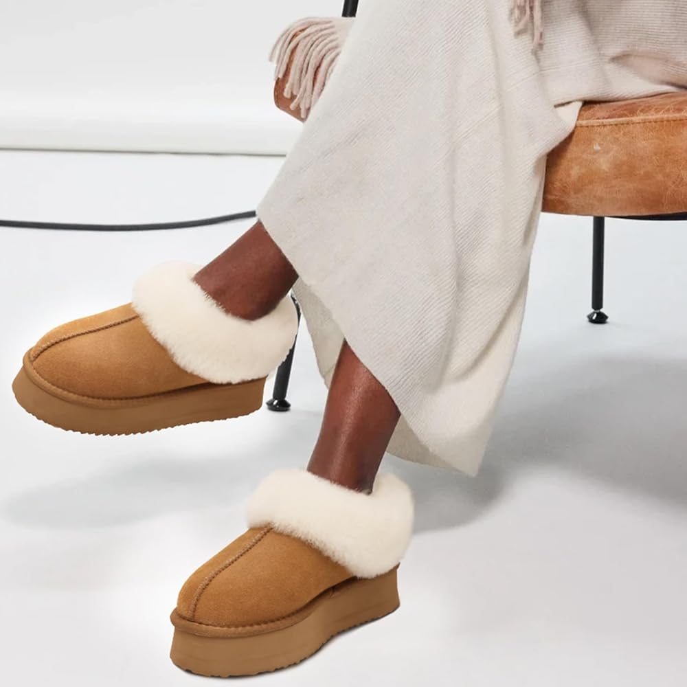 【شبشب منصة】 تم تصميم الشباشب النسائية من جلد سويدي البقر المسامي، وياقة شيرلينغ دافئة وناعمة وبطانة من الفرو الصناعي، مريحة ودافئة. طوق الفرو يحبس درجة الحرارة بشكل أفضل، مما يضمن الدفء والراحة طوال اليوم. يمكن أن يتم عصر ياقات الشيرلينغ الناعمة أثناء فترات النقل الطويلة، قم بتمشيطها بفرشاة صغيرة أو مشط للحصول على ياقة فرو ناعمة ورقيقة.