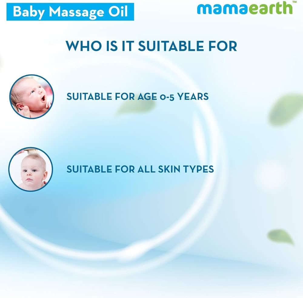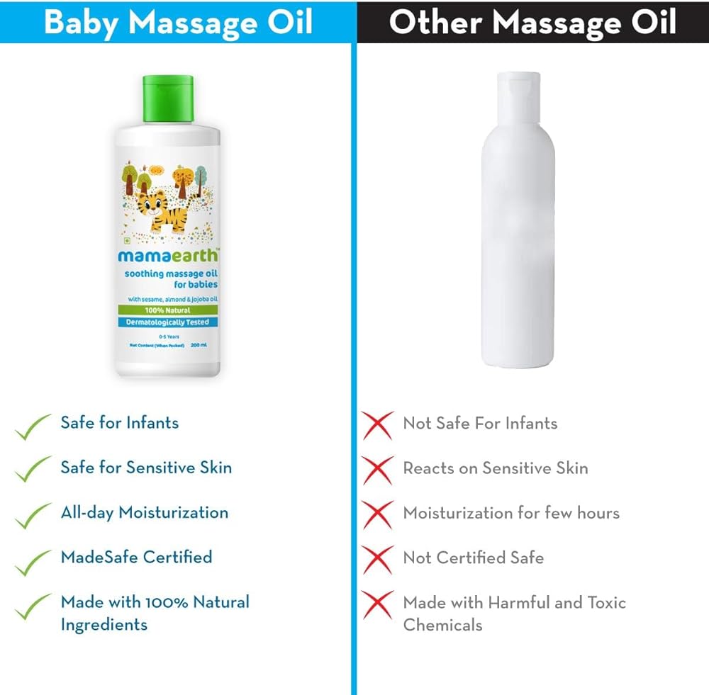 Babies bring with them happiness that's unlike any other feeling! As a mother, you want your baby to always stay healthy and strong. This starts with massaging them for not only stronger bones but also nourished skin. Hi! I am Mamaearth Soothing Massage Oil for Babies. I am made with 100% natural ingredients such as Sesame, Almond, Jojoba, and Coconut Oil. Almond Oil moisturizes while repairing dry skin. Jojoba Oil makes skin soft and nourished while keeping sun damage away. That's not all. Massage time is also great for bonding with your baby. It's the best form of love you can give your little one! I am dermatologically tested and hence suitable for your baby's sensitive skin. I am MadeSafe Certified, which means that I contain no Harmful Chemicals, Toxins, Mineral Oils or Parabens. I am 100% safe for your bundle of joy.