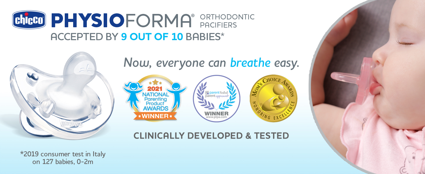 The PhysioForma exclusive nipple design was developed, tested, and approved in partnership with an advisory panel of leading neonatologists, pediatricians, and orthodontists. The one-piece Soft Silicone pacifiers also adhere to the guidelines of the American Academy of Pediatrics and are accepted by 9 out of 10 babies.