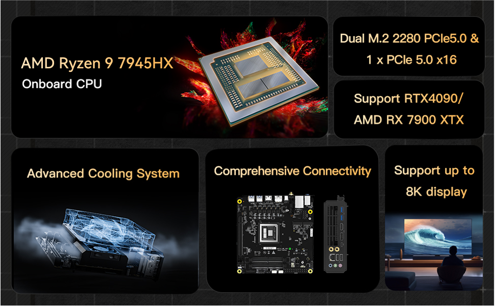 💥【PCle 5.0 x16】تحتوي اللوحة الأم BD790i على فتحة بطاقة رسومات PCIe 5.0 x16 مدمجة كاملة السرعة، والتي يمكنها إطلاق الإمكانات الكاملة للمكونات عالية الأداء. مناسبة لمجموعة متنوعة من السيناريوهات التي تتطلب رسومات عالية الأداء. (دعم نفيديا RTX4090/AMD RX 7900 XTX).
