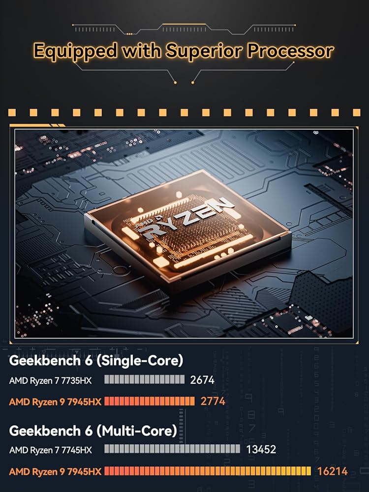 💥【AMD Ryzen 9 7945HX، على متن الطائرة】 مزود بمعالج AMD Ryzen 9 7945HX، و16 نواة/32 خيطًا (ذاكرة تخزين مؤقت 64 ميجابايت، حتى 5.4 جيجا هرتز)، وAMD Radeon 610M (تردد رسومات 2.2 جيجا هرتز)، وTSMC 4nm وZen 4 Architecture. يوفر سرعة رد فعل أسرع واستجابة حساسة لتعدد الخيوط.