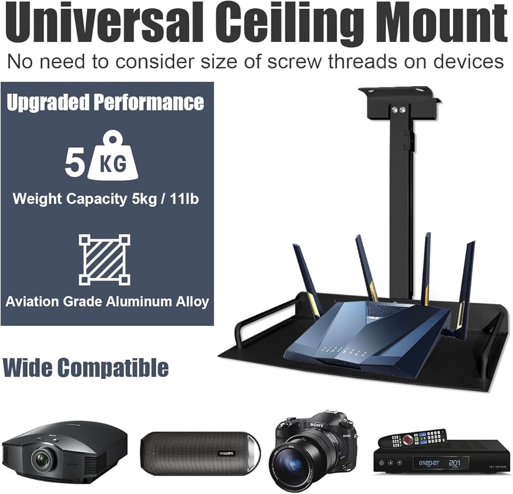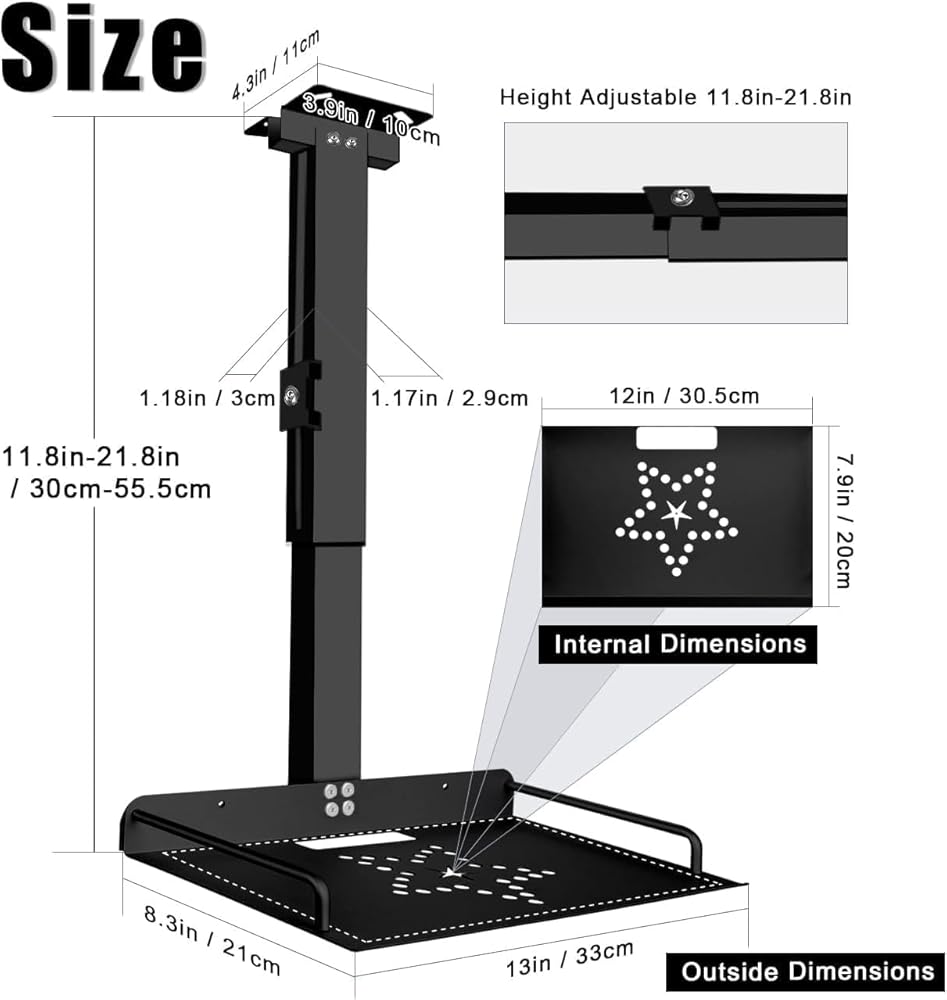 تعديل الارتفاع: يمكن تركيب حامل السقف على رف جهاز العرض على السقف. يمتد القطب 11.8 بوصة - 20.5 بوصة / 30 سم - 52 سم. استمتع بأفضل زاوية رؤية وتأكد من أن أجهزتك آمنة ومحمية. يُعد حامل السقف لجهاز العرض المزود بدرج مثاليًا للمسارح المنزلية وغرفة النوم والفصول الدراسية وغرف المؤتمرات وغرف الانتظار ومراكز اللياقة البدنية والمزيد!