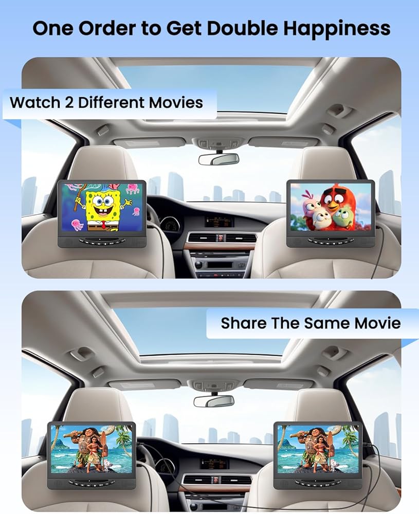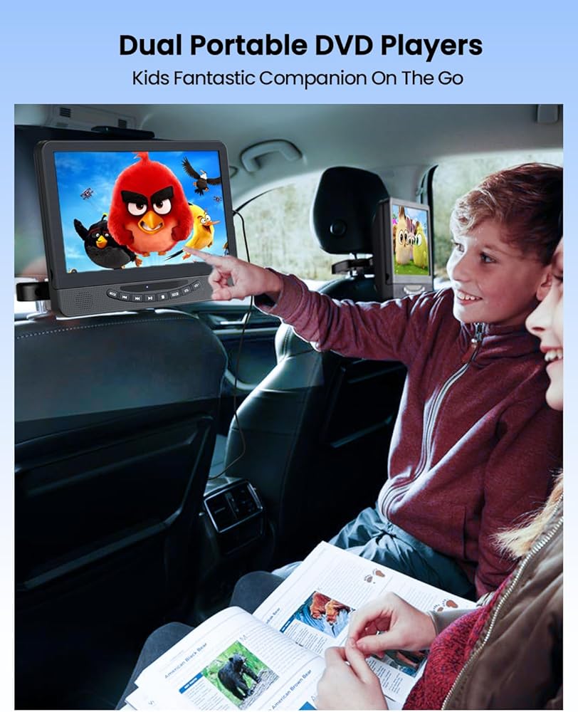 💗【خدمة مرضية بنسبة 100%】ضمان استرداد الأموال لمدة 30 يومًا وخدمة عملاء احترافية ودعم فني مدى الحياة. إذا كانت لديك أي مشاكل أثناء الاستخدام، فلا تتردد في الاتصال بنا. 【ما تحصل عليه: 2x مشغل DVD محمول، 2x دعامة تثبيت، 6x حزام مسند الرأس، 2x جهاز تحكم عن بعد، 1x مقسم شاحن سيارة، 1x محول تيار متردد، 1x كابل AV، 1x كابل RCA، 1x كابل AUX، 1x دليل المستخدم، 1x دليل البدء السريع، 1x مفك البراغي.