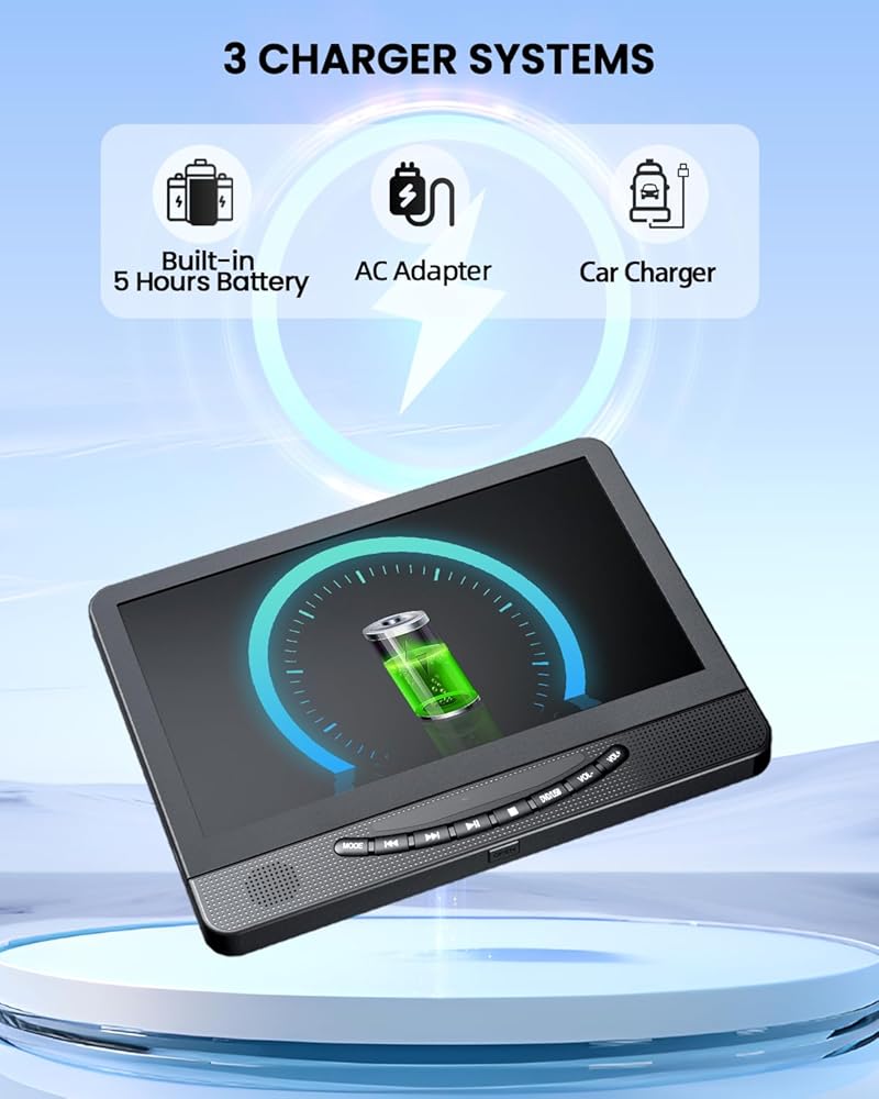 🔋[مشغل DVD للسيارة قابل لإعادة الشحن] يتميز مشغل DVD المزدوج للسيارة ببطارية ليثيوم موثوقة عالية السعة قابلة لإعادة الشحن، ولا حاجة للتوصيل طوال الوقت أثناء الاستخدام. مزود بثلاثة مصادر طاقة - بطارية مدمجة، وشاحن سيارة، ومحول طاقة تيار متردد، مما يضمن لك الاستمتاع بالأفلام لفترة طويلة.