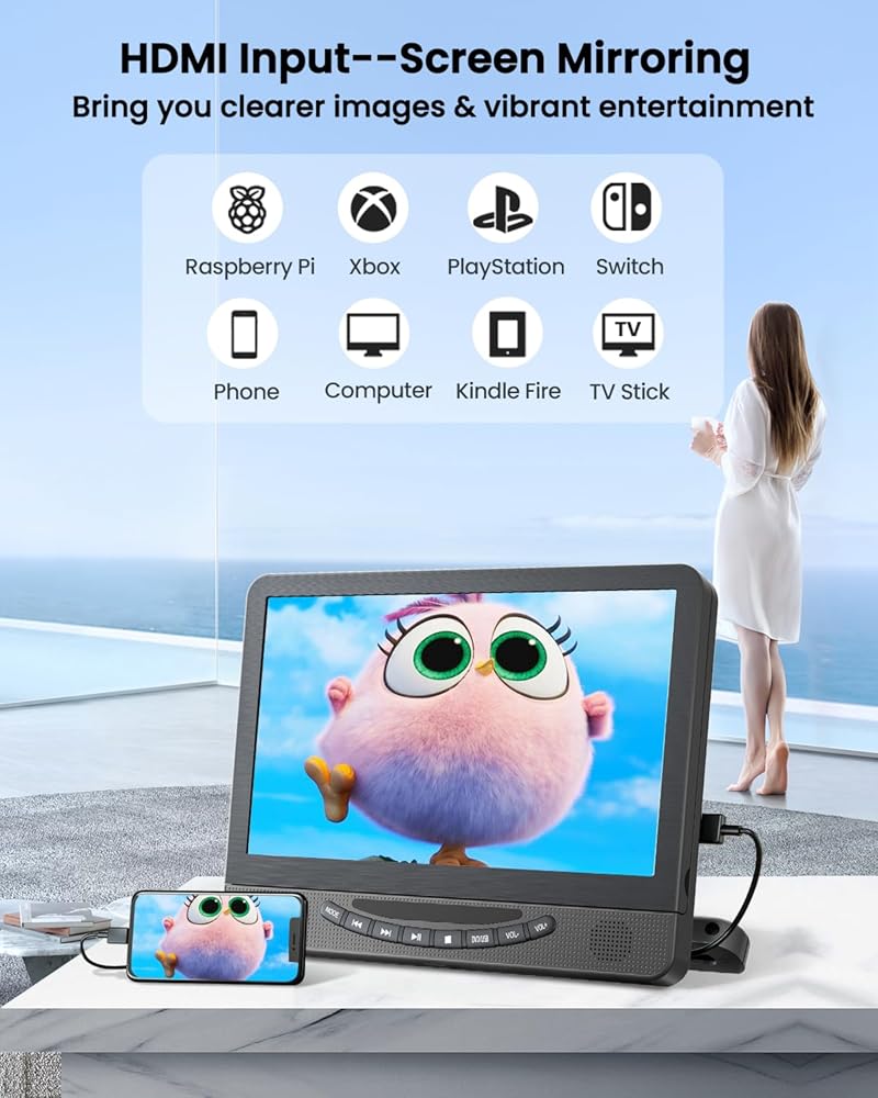 ①【إدخال ومزامنة تلفزيون HDMI】يمكن لمشغل DVD المزدوج للسيارة DESOBRY مع وظيفة إدخال HDMI مزامنة ما يصل إلى 1080 بكسل من الفيديو والصوت من الهواتف أو أجهزة الكمبيوتر أو Raspberry Pi أو Xbox أو Kindle Fire وما إلى ذلك. (ملاحظة: ①يرجى التأكد من أن هاتفك يدعم إخراج HDMI قبل الطلب.②يدعم مشغل DVD للسيارة مدخل HDMI فقط، ولا يدعم الإخراج.) مع وظيفة AV In/Out، يمكنك توصيل مشغل الأفلام هذا بالتلفزيون عبر كابل RCA المرفق للاستمتاع بالأفلام على شاشة كبيرة مع عائلتك.