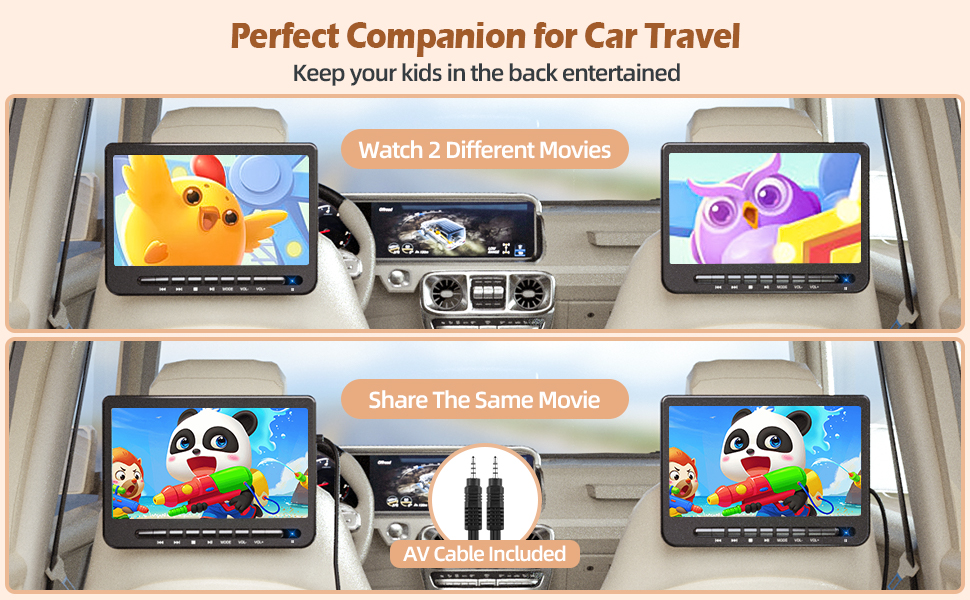 • 🚗 【رؤية عالية الدقة 1080 بيكسل مطورة】اعتماد شاشة حماية العين عالية الدقة بالكامل، يوفر لك مشغل DVD المحمول المزدوج من DESOBRY تشغيل فيديو عالي الدقة 1080 بيكسل، مما يمنحك تجربة مشاهدة رائعة ويحمي عيون الأطفال. يمكن لمشغل DVD بمسند رأس السيارة المزدوج أن يعمل على التوالي، ويدعم تشغيل فيلمين مختلفين بشكل منفصل أو عكس نفس قرص DVD على كلا الشاشتين ببساطة عبر اتصال كابل AV.