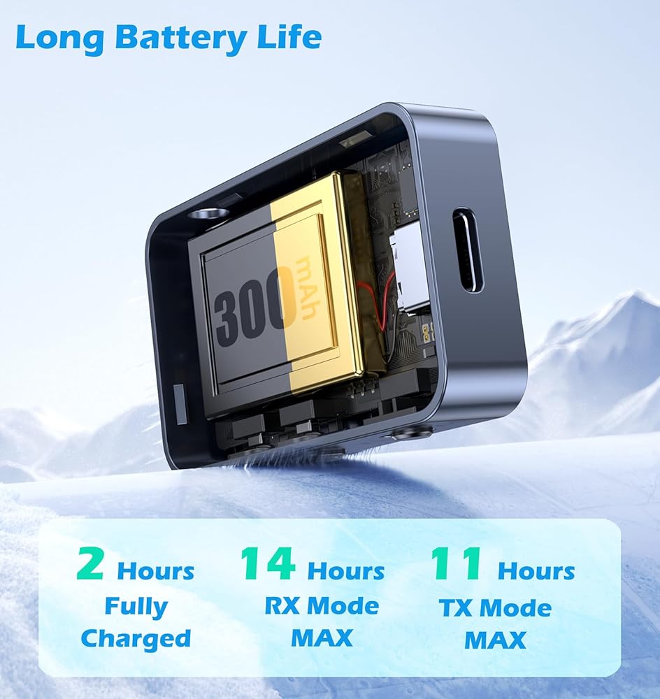 • شاشة الترقية: يمكن لشاشة محول aux إلى Bluetooth عرض وضع TX أو RX، ومستوى الصوت، والبطارية المتبقية. جهاز إرسال البلوتوث مجهز أيضًا بكابل شحن من النوع C ويمكن شحنه بالكامل خلال ساعتين فقط.