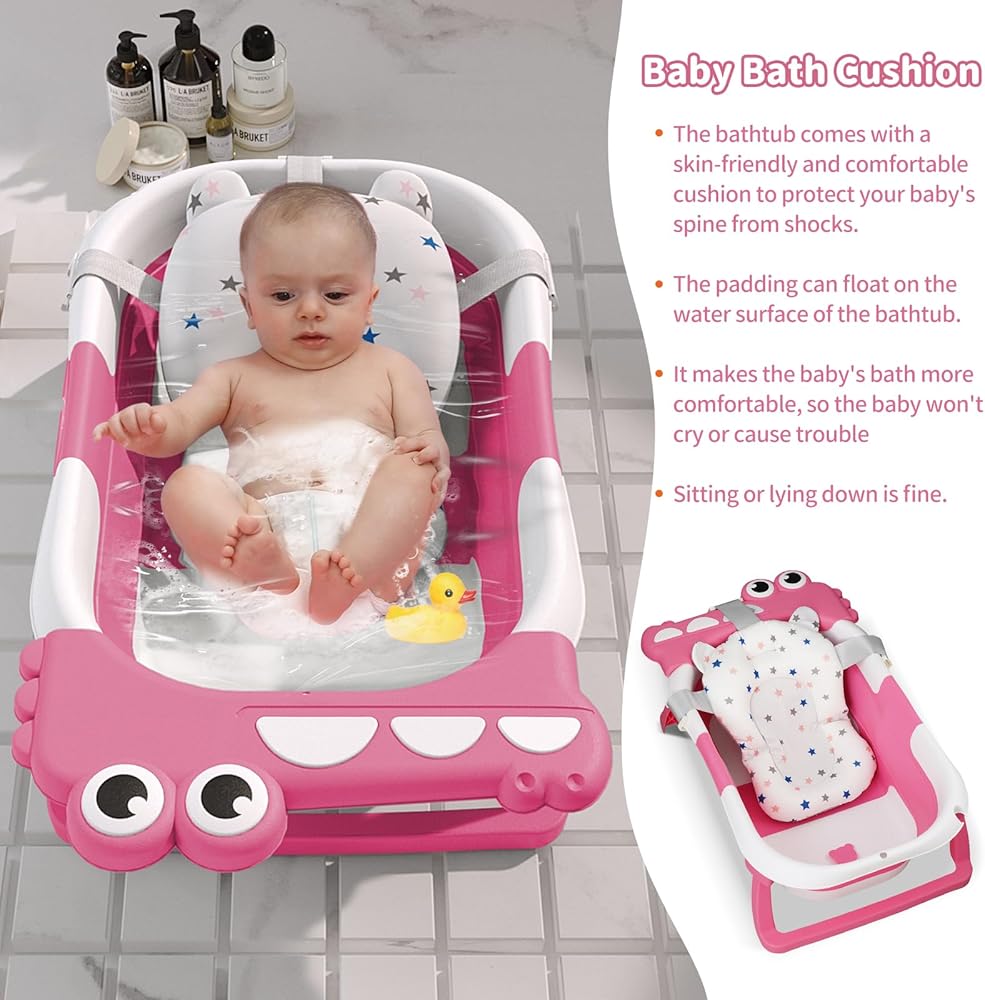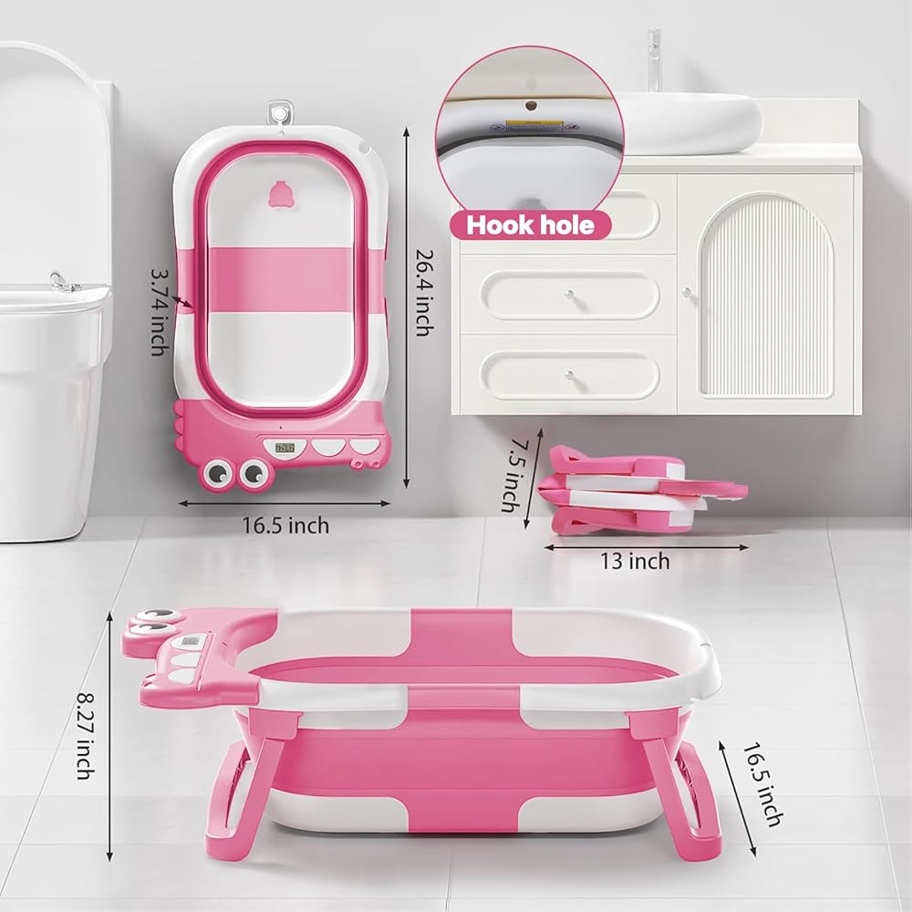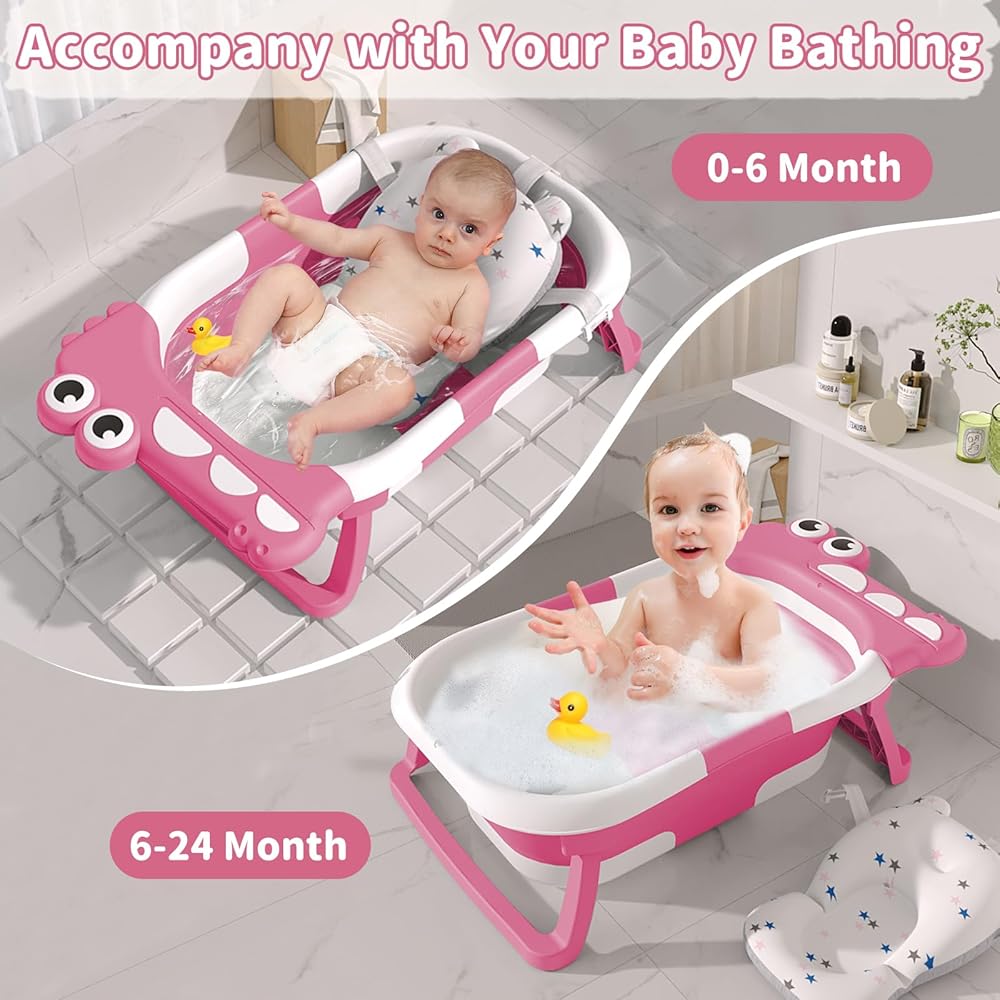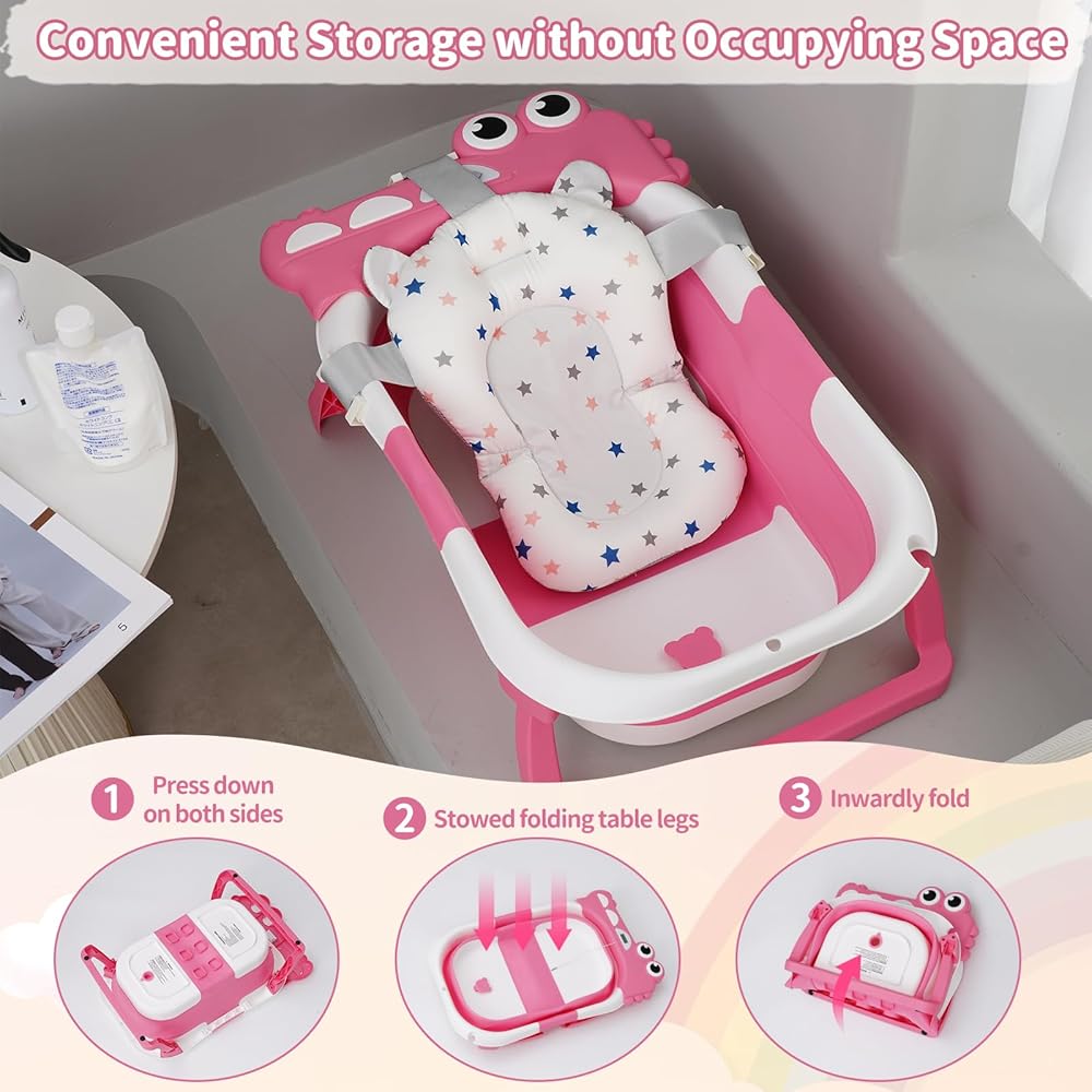 حوض استحمام للأطفال قابل للطي للرضع والأطفال الصغار مع وسادة عائمة لمراقبة درجة الحرارة في الوقت الحقيقي، مجموعة حوض استحمام للأطفال قابلة للطي من عمر 0 إلى 36 شهرًا، حوض استحمام محمول للسفر للأطفال حديثي الولادة الأولاد والبنات (وردي)