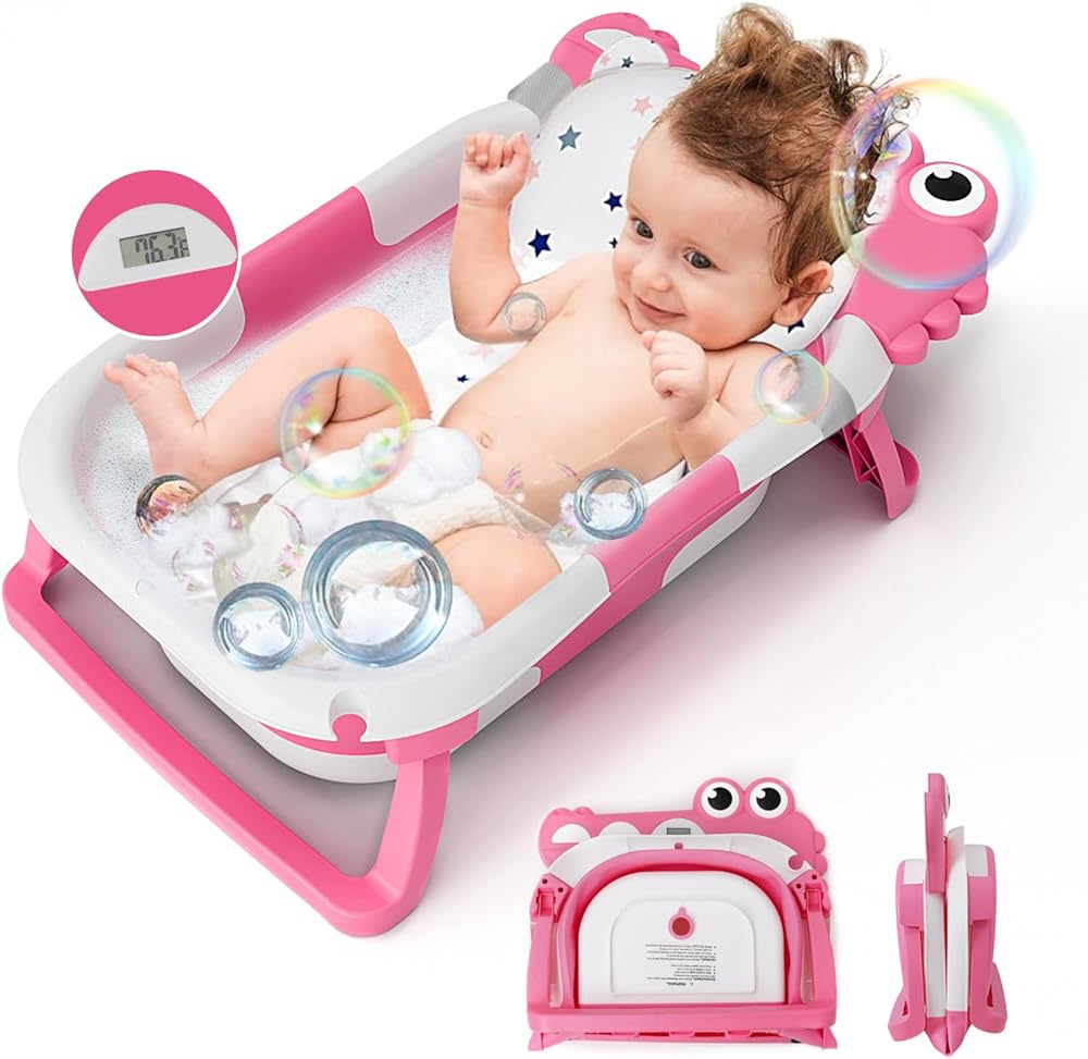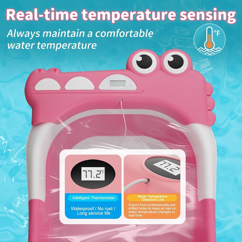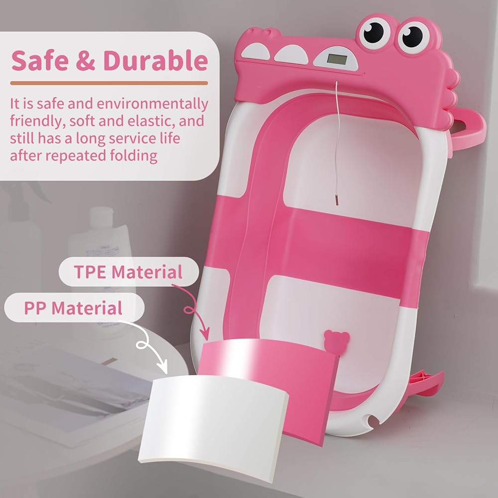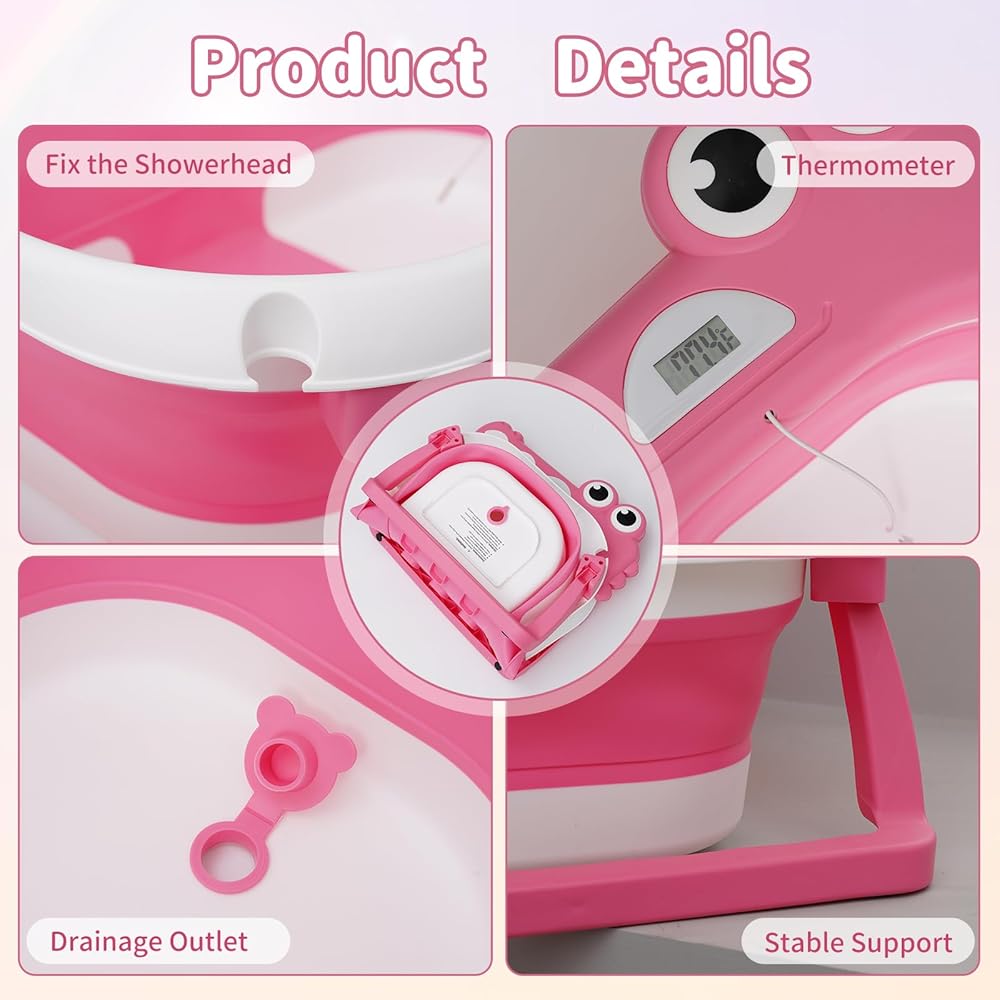 حوض استحمام للأطفال قابل للطي للرضع والأطفال الصغار مع وسادة عائمة لمراقبة درجة الحرارة في الوقت الحقيقي، مجموعة حوض استحمام للأطفال قابلة للطي من عمر 0 إلى 36 شهرًا، حوض استحمام محمول للسفر للأطفال حديثي الولادة الأولاد والبنات (وردي)