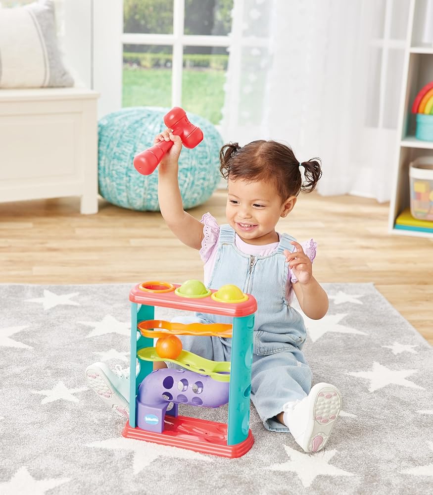 RAINBOW CASCADE: Pound 3 colorful balls through the tower and watch them race down the levels, creating a mesmerizing spectacle. Keeps little minds engaged and sparks imaginative play.