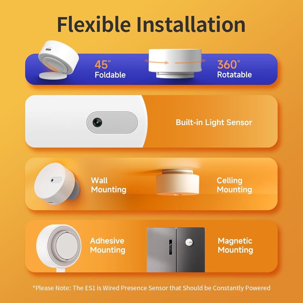 【𝐅𝐥𝐞𝐱𝐢𝐛𝐥𝐞 𝐈𝐧𝐬𝐭𝐚𝐥𝐥𝐚𝐭𝐢𝐨𝐧 & 𝐁𝐫𝐨𝐚𝐝 𝐃𝐞𝐭𝐞 𝐜𝐭𝐢𝐧𝐠 𝐑𝐚𝐧𝐠𝐞】يحتوي مستشعر الحركة Alexa ES1 على قاعدة مغناطيسية قابلة للفصل/اللصق تدعم طي 45 درجة وتدوير 360 درجة، يمكنك التثبيت على الحائط أو التثبيت على السقف مع نطاق كشف أقصى يبلغ 20 قدمًا.