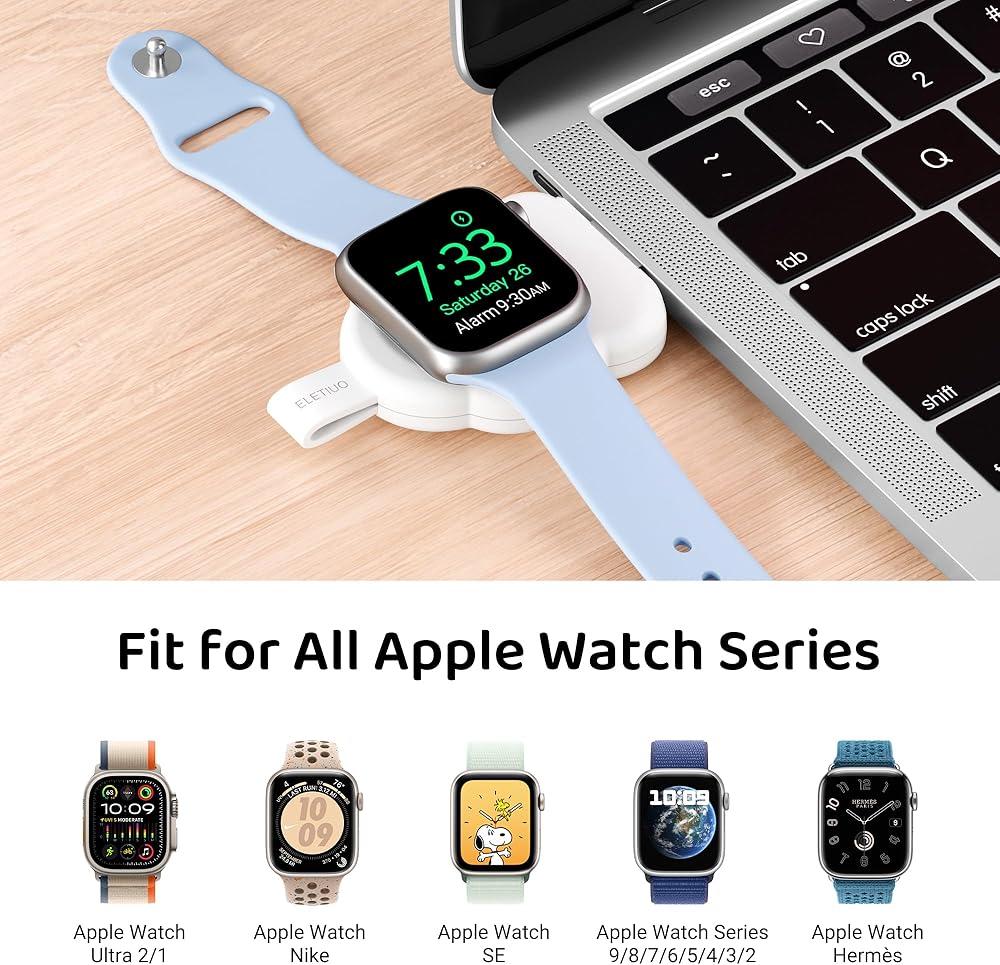 Equipped with a powerful magnetic adsorption module,it ensures seamless and secure charging.The charger features a USB-A port for direct connection.Compatible with Apple Watch Ultra2 Ultra SE2 SE Series 9 8 7 6 5 4 3 2 1(49mm 45mm 44mm 42mm 41mm 40mm 38mm).This portable watch charger ensures reliable and efficient charging for all Watch users.