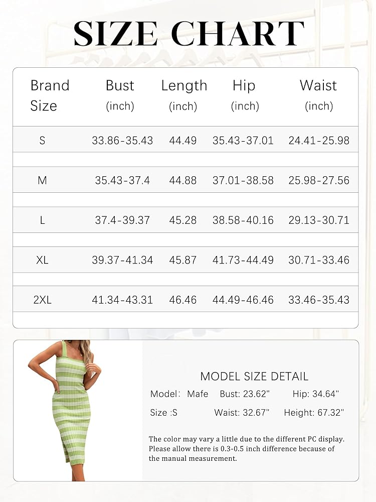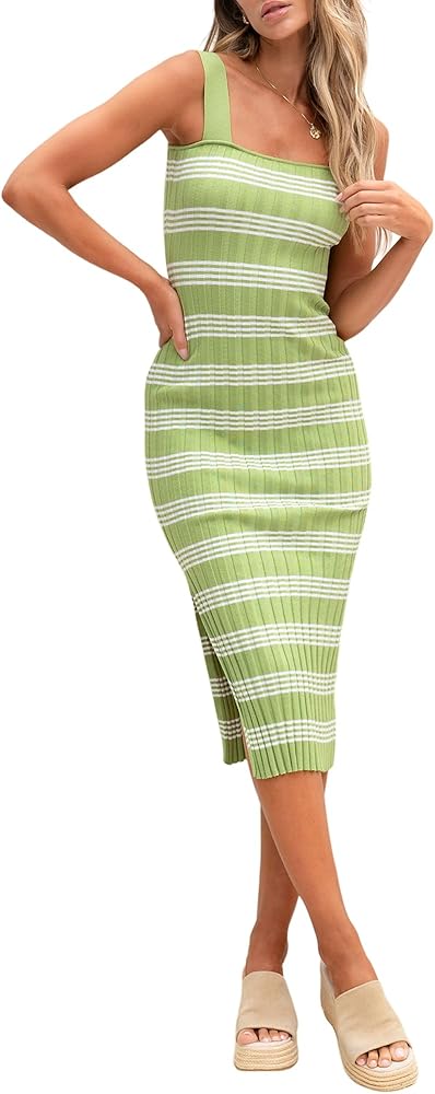 المواد: نسيج محبوك مريح وناعم، قابل للتمدد وأكثر ملاءمة لمنحنيات جسمك؛ الفستان النسائي المحبوك المخطط بياقة مربعة بدون أكمام هو موضة عام 2024
