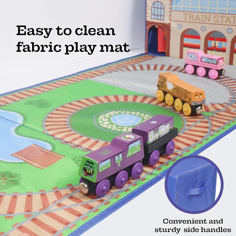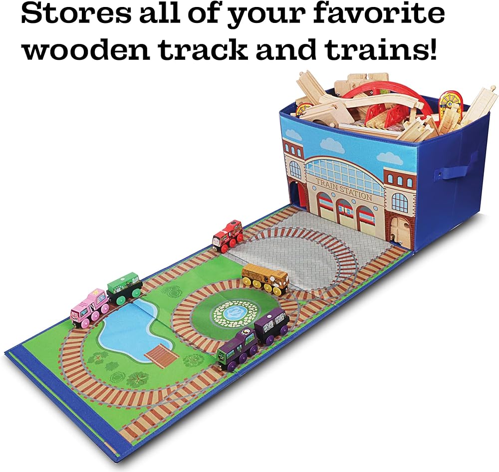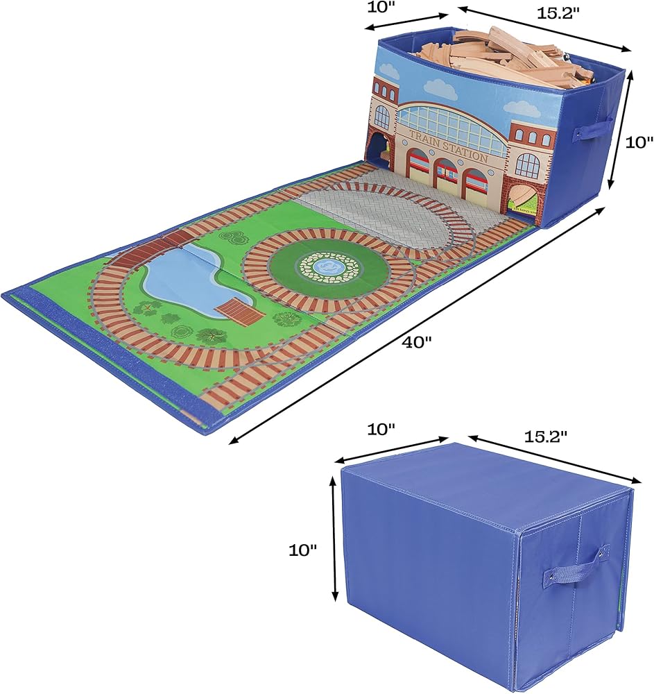 صندوق تخزين القطار وبساط اللعب - صندوق تخزين خشبي للسكك الحديدية مع تصميم مسارات القطار - تخزين لعبة سيارة قابلة للطي اثنين في واحد مع محطة - صندوق قماشي لجراج السيارة