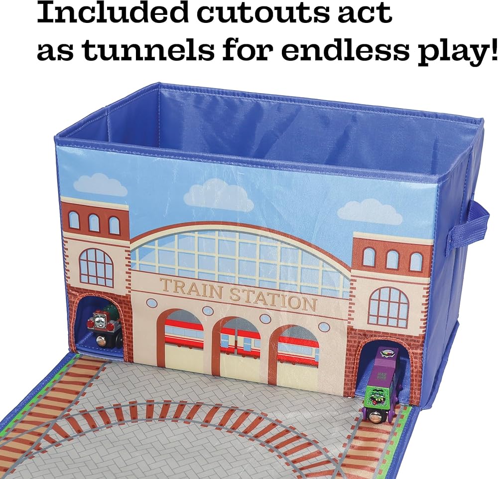 • تصميم اثنان في واحد - يمكن استخدامه كسلة تخزين يمكن حملها وسجادة لعب. انتقل من وقت اللعب إلى التنظيف في ثوانٍ! يمكن استخدام غطاء صندوق التخزين كحصيرة لعب لجميع القطارات والسيارات والشاحنات والمركبات الخشبية.