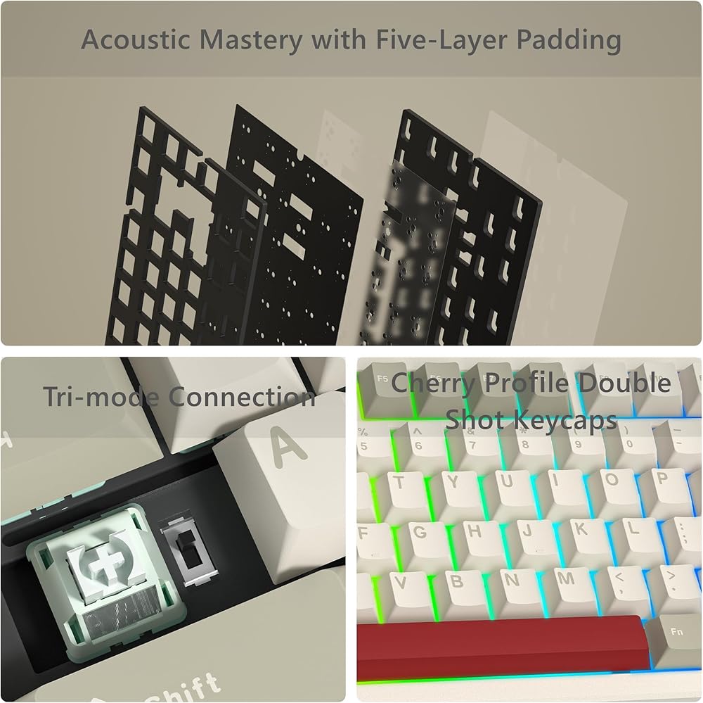 【لوحة مفاتيح ألعاب لاسلكية كريمية قديمة】لوحة مفاتيح G75 75% ذات 3 أوضاع مع أغطية مفاتيح PBT عالية الجودة، الاستخدام لفترة طويلة ليس متعبًا. يعتمد المفتاح على عمود طويل POM وغطاء PC لتوفير تجربة كتابة أفضل مع قوة تشغيل 40 جرامًا وزنبرك 22 مم على مرحلتين. مفتاح القهوة Womier يجعل لوحة المفاتيح الخيار الأمثل لأي شخص يريد تحسين سرعة ودقة الكتابة.