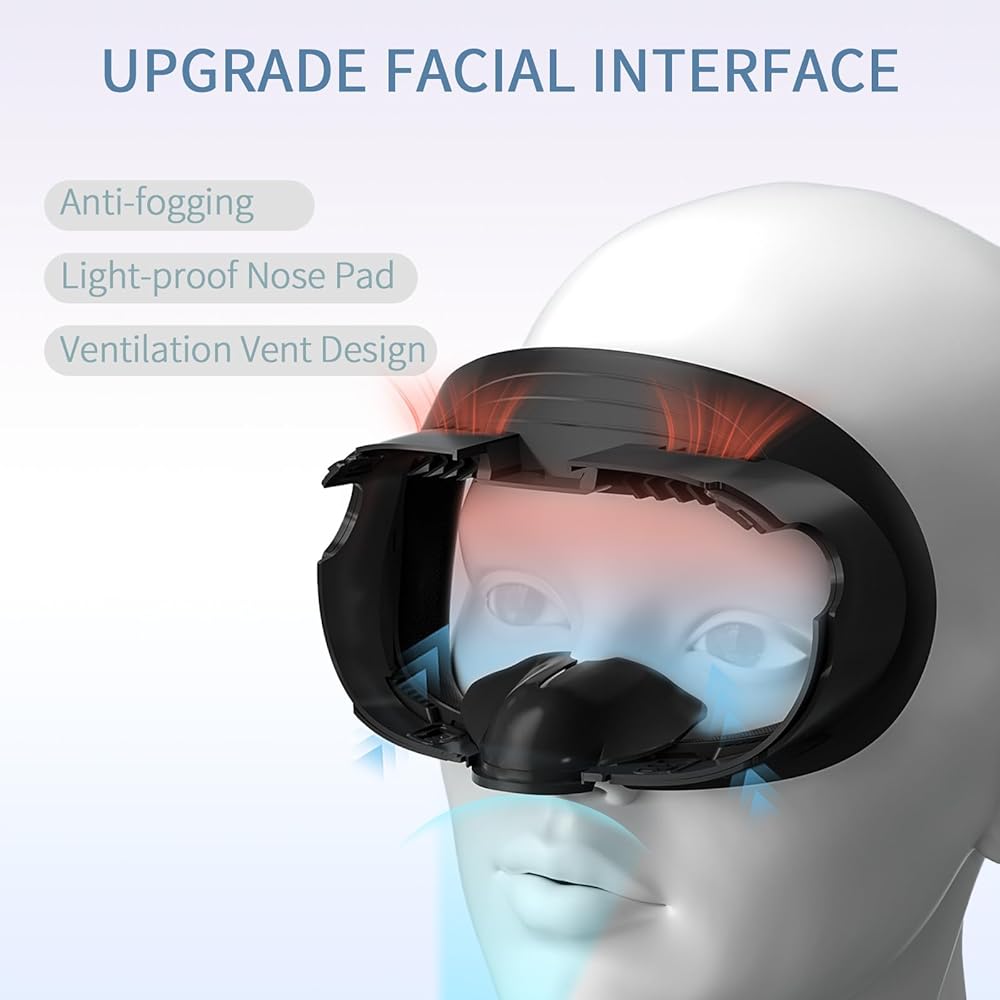 وسادة أنف مضادة للتسرب: دعامة واجهة الوجه مع وسادة أنف بتصميم قطعة واحدة، لم تعد هناك حاجة للقلق بشأن تسرب الضوء لسماعة الرأس. مما يسمح لك بالانغماس بالكامل في العالم الافتراضي دون تدخل من مصادر الإضاءة الخارجية.