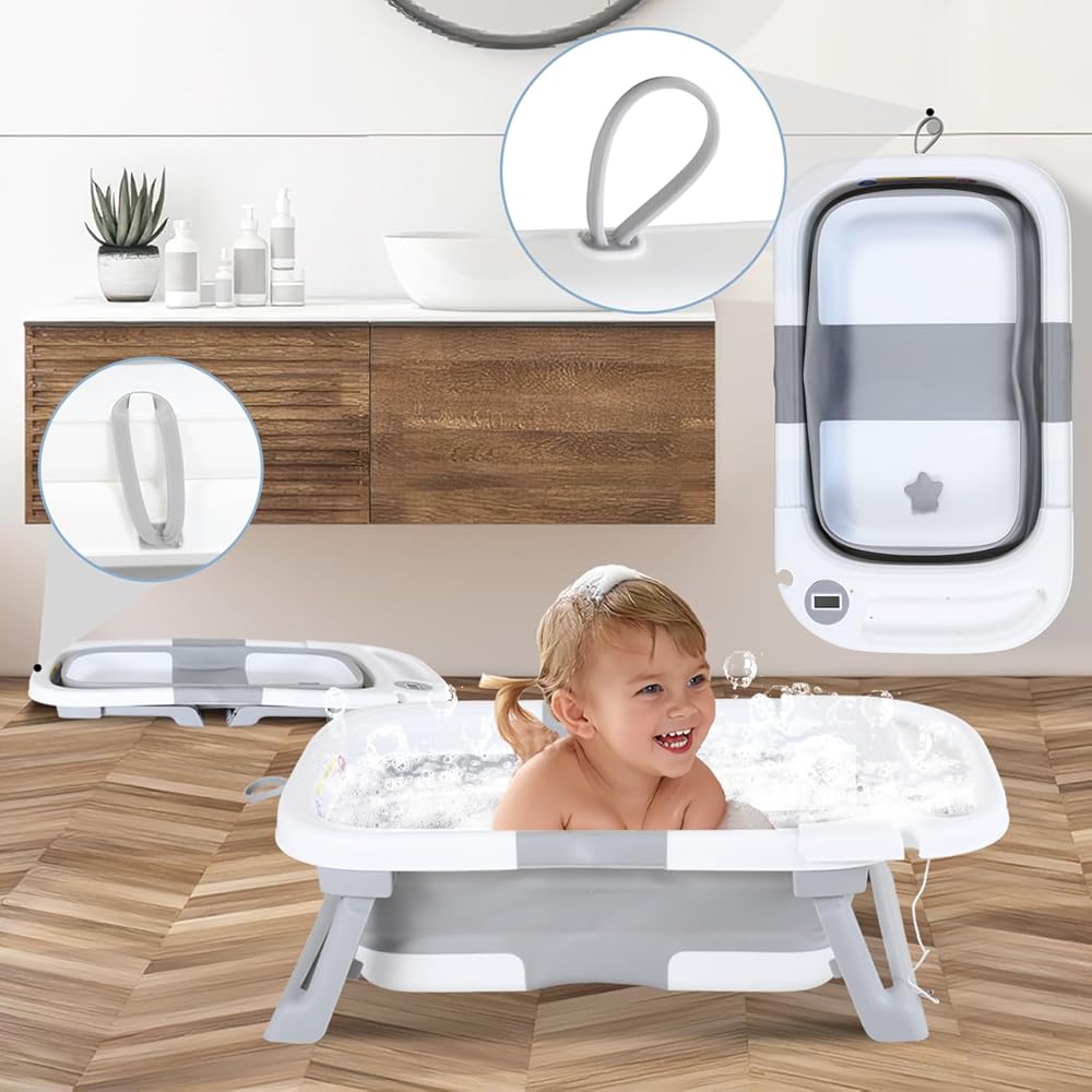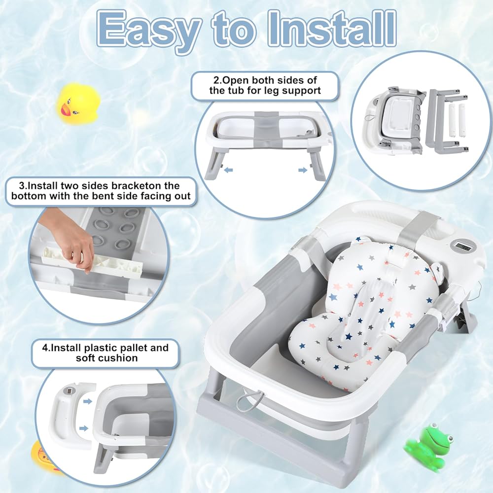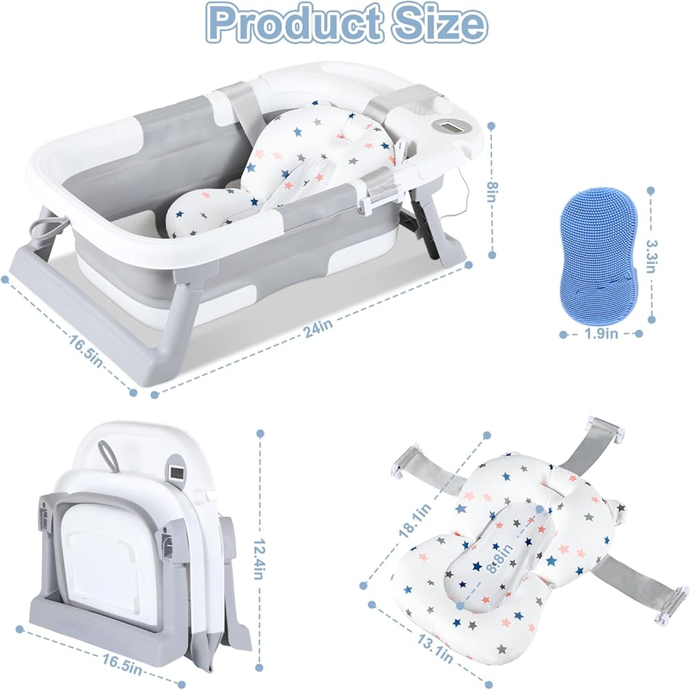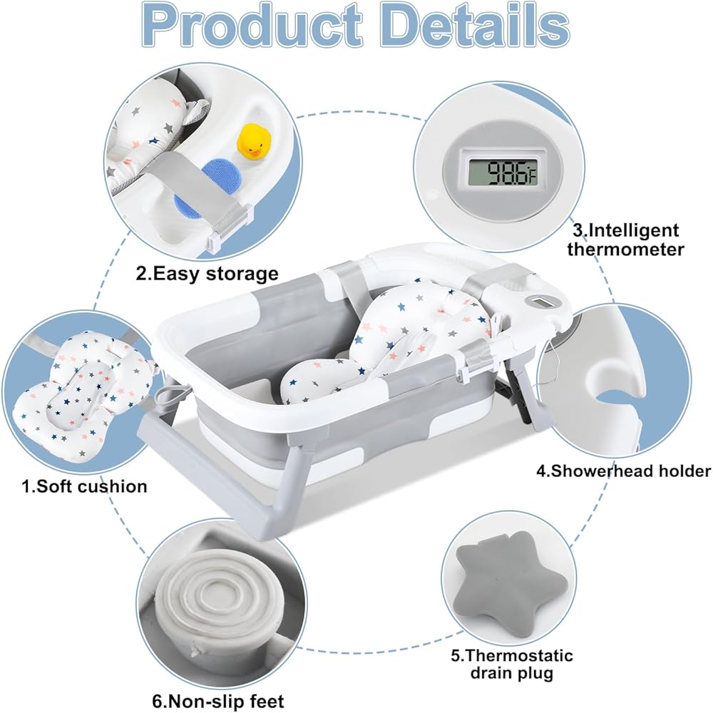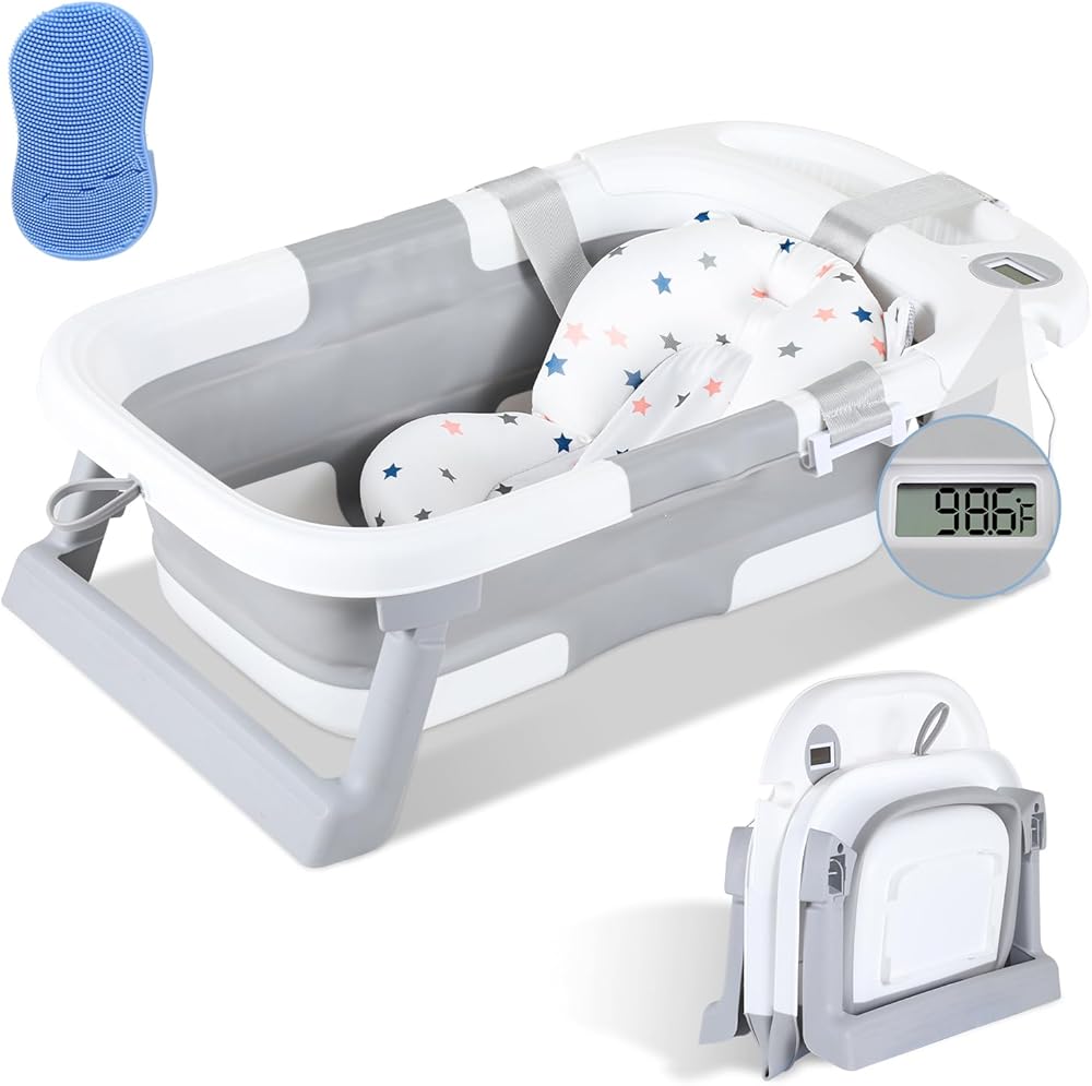 حوض استحمام للأطفال قابل للطي، حوض استحمام محمول للسفر للأطفال مع ميزان حرارة ووسادة ناعمة، حوض استحمام قابل للطي لحديثي الولادة إلى الأطفال الصغار من عمر 0 ​​إلى 36 شهرًا، أحواض استحمام متينة معلقة غير قابلة للانزلاق مع فرشاة غطاء المهد