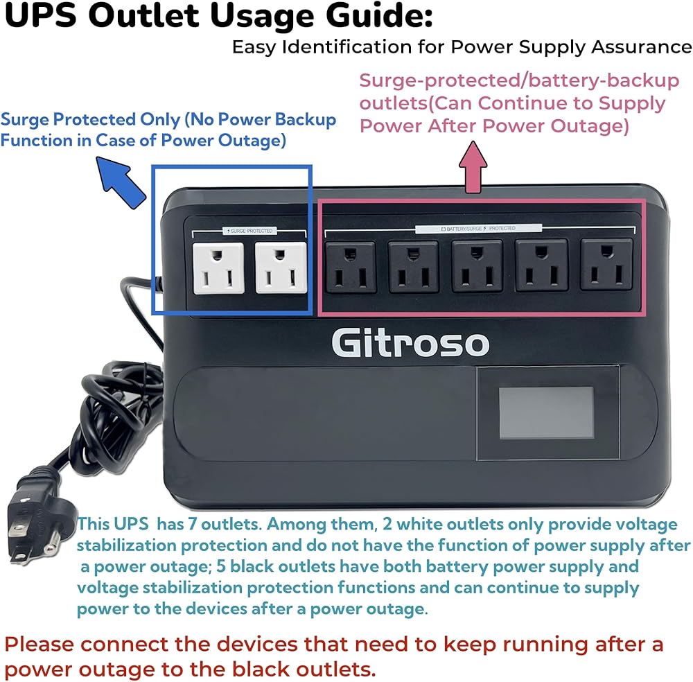 AVR and Sockets: Automatic Voltage Regulation protects connected devices by stabilizing incoming voltage levels.7 Outlets provide battery backup and surge protection(Battery is charged),2 outlets provide surge protection only(Mains electricity is connected).