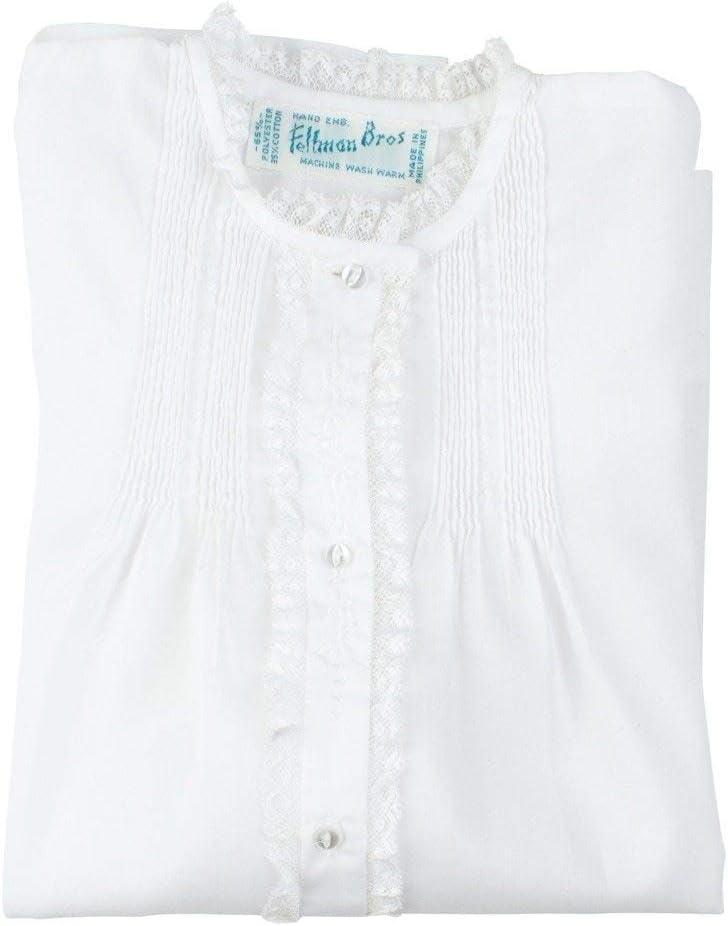 The gown features fluted lace trim around the neck, sleeves, and button placket, as well as hand stitched pintucks and floral embroidery.
