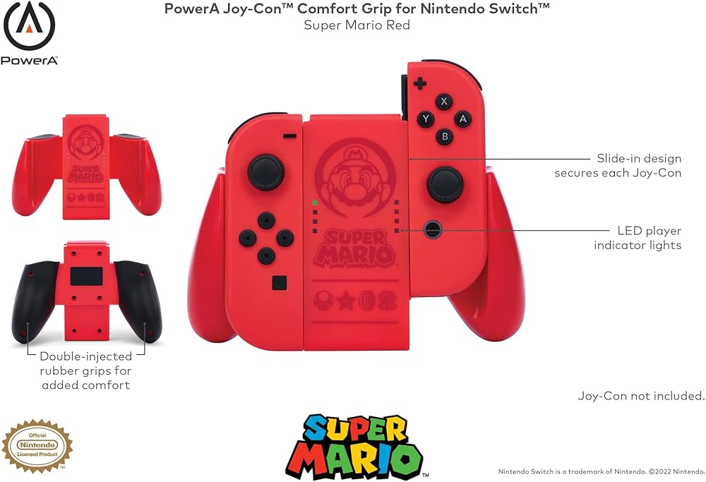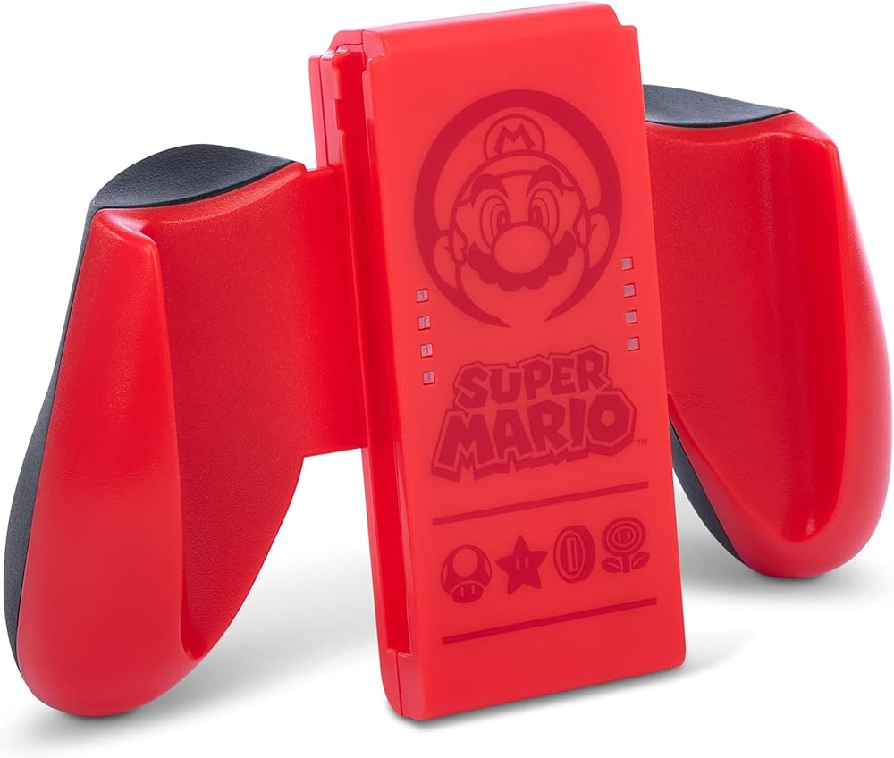 The Joy-Con Comfort Grip transforms the left and right Joy-Con into a single comfortable video game controller for Nintendo Switch. The ergonomic rubber grips keep your palms happy and your fingers from cramping during those long play sessions. Simply slide each Joy-Con Controller down the rails until they click, which allows the player indicator lights to shine through the center panel. Plus, the Comfort Grip stands up on its own, so you can display it next to your Nintendo Switch Dock.