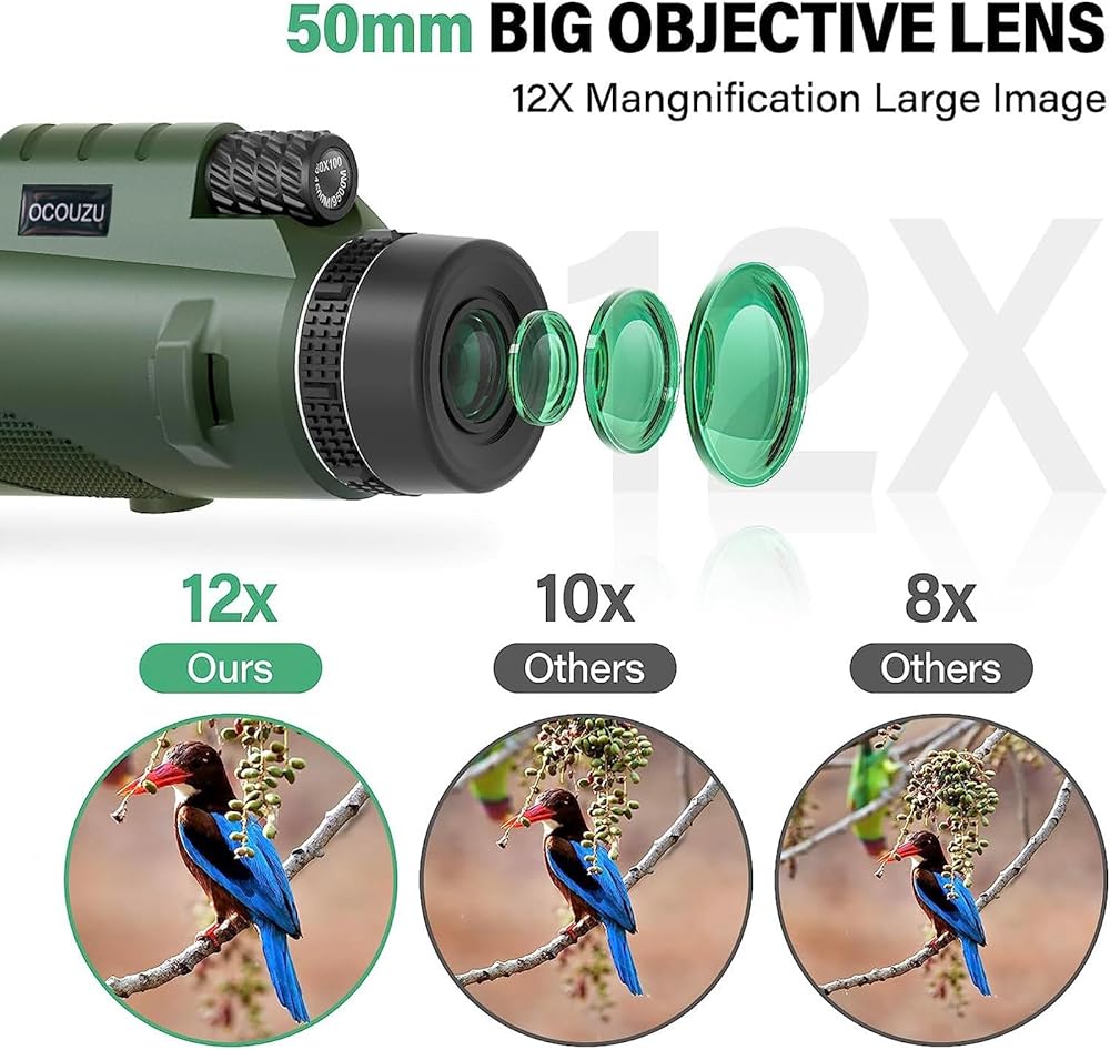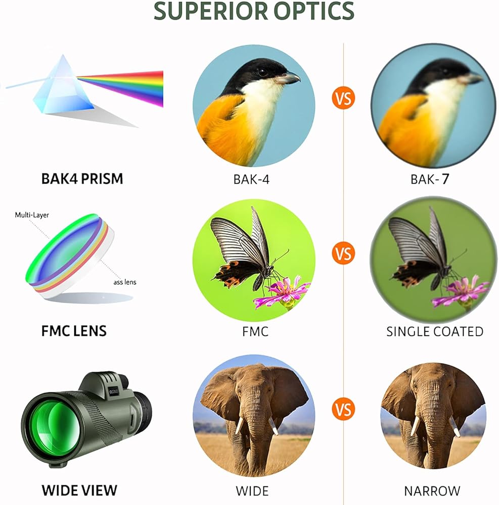 【تباين ودقة عالية】هذا التلسكوب أحادي العين مع منشور BAK-4 وعدسة مطلية بالكامل، يصل نفاذية الضوء إلى 99.9%. مثالية لمشاهدة الطيور على المدى الطويل، وسيارات السباق، وألعاب الكرة، والمشي لمسافات طويلة، ومشاهدة النجوم، واستكشاف الطبيعة.