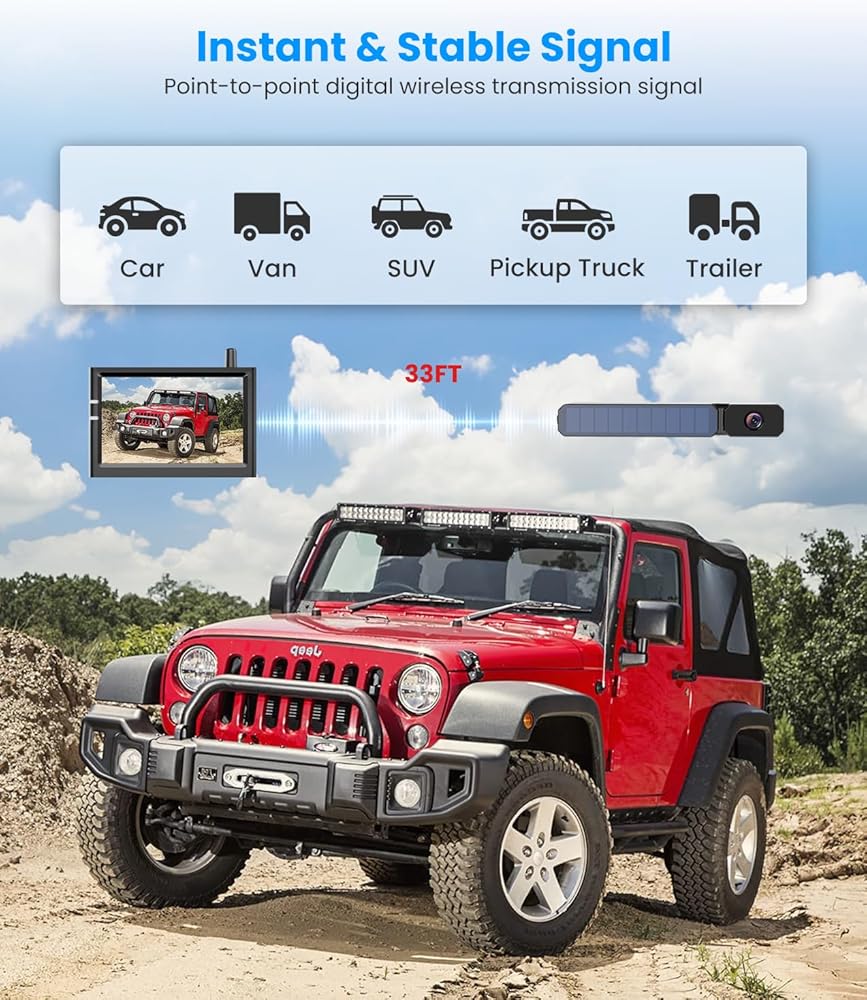 إشارة قوية ومستقرة: تستخدم الكاميرا الاحتياطية اللاسلكية للشاحنات تقنية رقمية 2.4G دون تأخير في حدود 33 قدمًا. الكاميرا الاحتياطية مثالية للشاحنات الصغيرة والسيارات ومقطورات الخيول وسيارات الدفع الرباعي والشاحنات الصغيرة والقوارب وما إلى ذلك. توفر الكاميرا الاحتياطية اللاسلكية المزودة بشاشة مقاس 5 بوصات صورة ملونة وحيوية أثناء النهار والليل