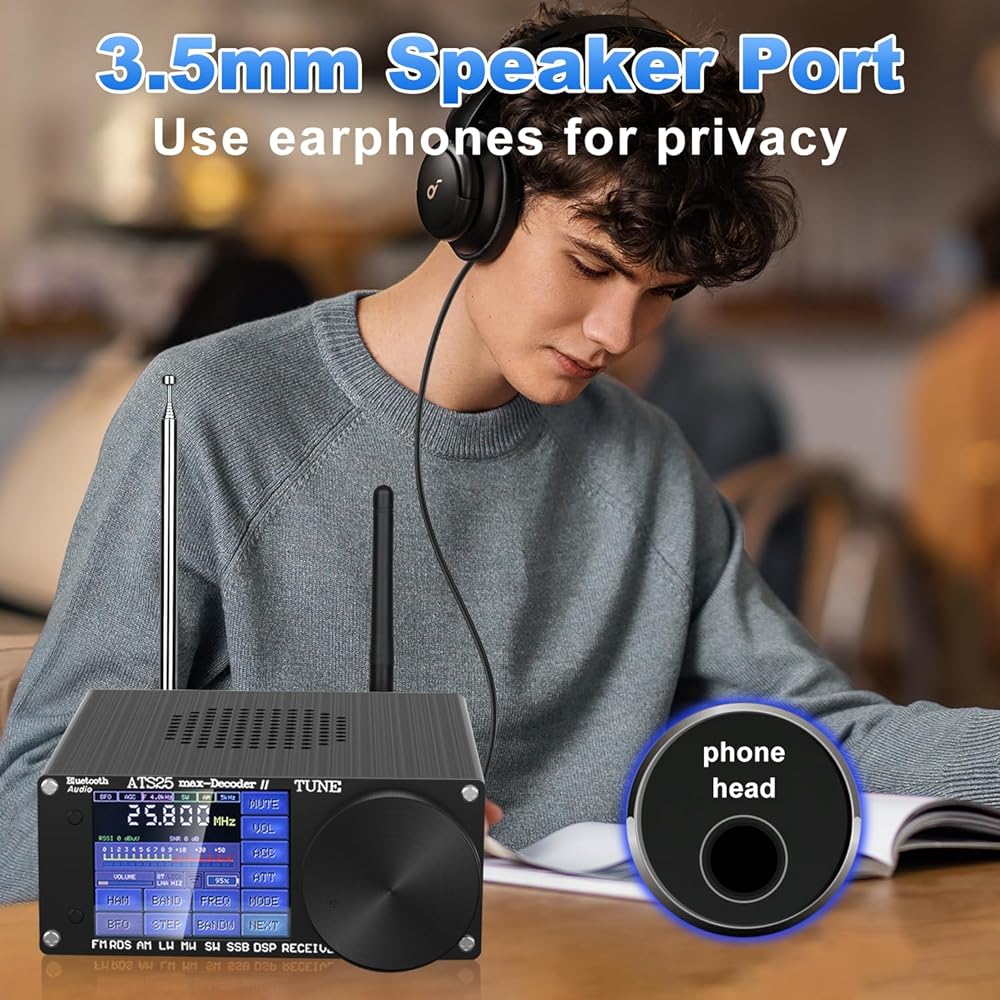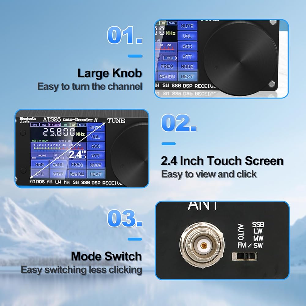 【Touchscreen Operation】ATS25 MAX DECODER 2 generation is equipped with a 2.4-inch touch screen for intuitive and easy operation,with a small stylus to reduce the frequency of mis-touch.This type radio receiverAdded scanning function, backlight adjustment,it has extra large knob for easy fine-tuning.The pages are simple, intuitive and easy to understand at a glance,Support 3.5mm stereo audio output,Type-C charging.