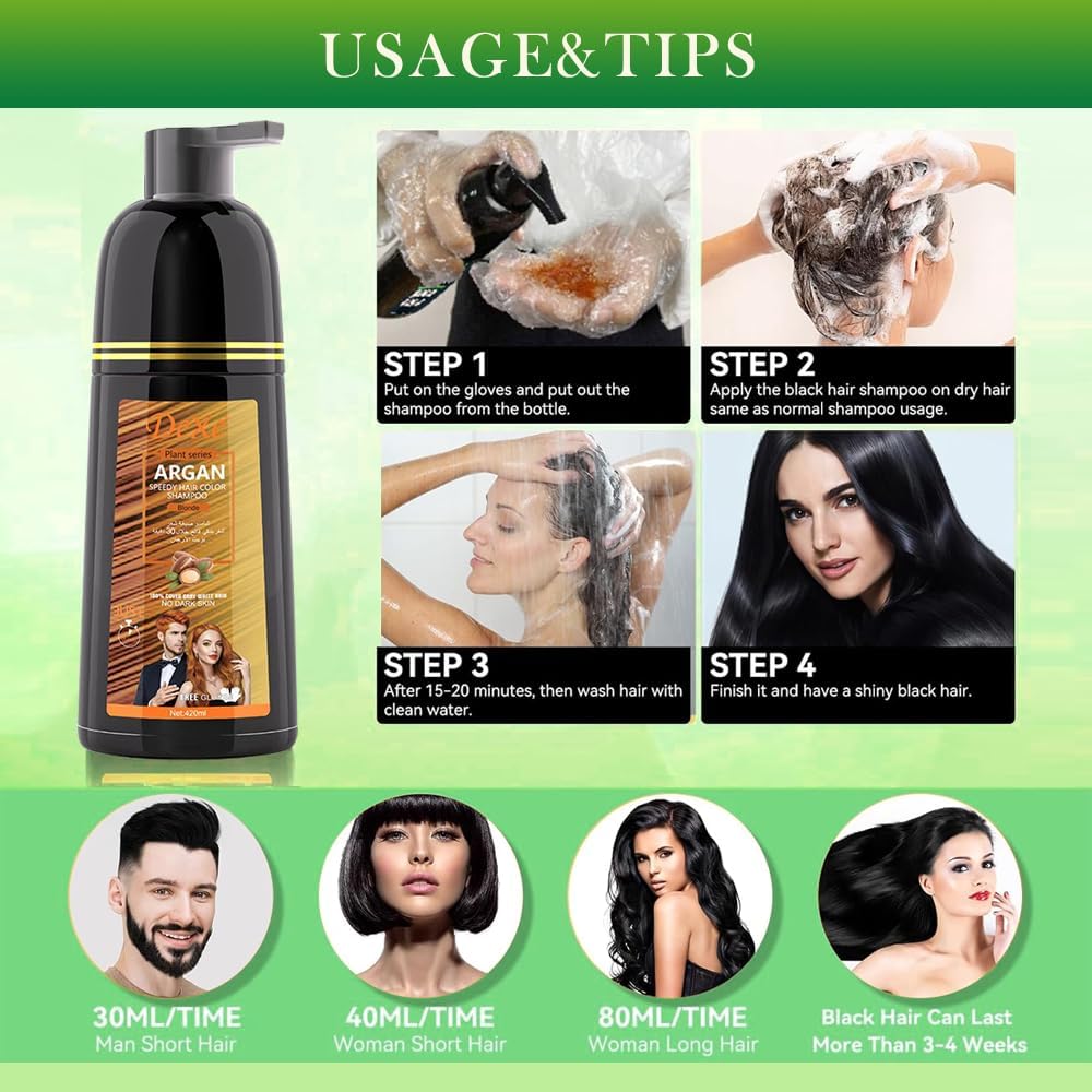 🌿【INSTANT BLACK HAIR DYE】 This product is simple and convenient to use, you can dye hair at home, just need to put on gloves, and use it the same as normal shampoo, wait for only 15-30 minutes, you will get the hair color you want.