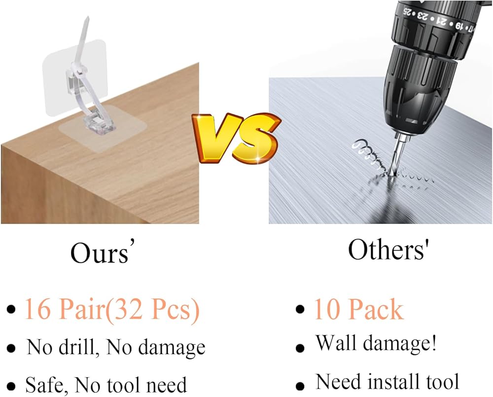 Drill-Free installation: Enjoy hassle-free setup with our no-drill wall anchors, ensuring home safety without damaging your walls. Simply clean the surfaces, peel off the protective film, firmly attach the anchors, and tighten the straps for a secure fit. Rest assured, our anchors leave no sticky residue upon removal.