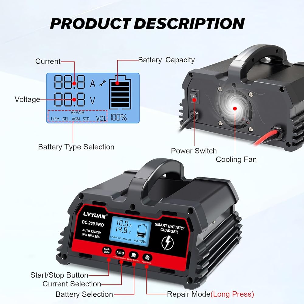 ِ 𝒊𝒈𝒆𝒏𝒕 𝑫𝒆𝒕𝒆𝒄𝒕𝒊𝒐𝒏: توفر الشاشة الرقمية الكبيرة رؤية واضحة لعملية الشحن وحالة البطارية. أثناء الشحن، يُظهر جهد الشحن وتيار الشحن ودرجة الحرارة المحيطة ونسبة الشحن. عند توصيلها بالبطارية للكشف عنها، يمكنك مراقبة الجهد المتبقي ومستوى الطاقة في البطارية، مما يضمن أنك تعرف دائمًا حالتها للاستخدام المريح.