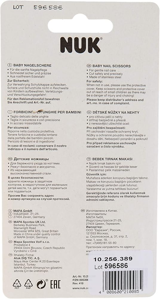 NUK Baby nail scissors, safe and precise, for baby nail care with protective cap. The NUK baby nail scissors offer great safety for small hands: they make nail care easy for the little ones and cut gently and precisely. The rounded tips ensure extra safety. The cutting surfaces are made of stainless steel. The handle is lined with non-slip soft material. A protective cap made of plastic is included for safe storage. The NUK baby nail scissors are available in various modern and fresh colours. Company contact: MAPA GmbH, Industriestrasse 21-25, D-27404 Zeven