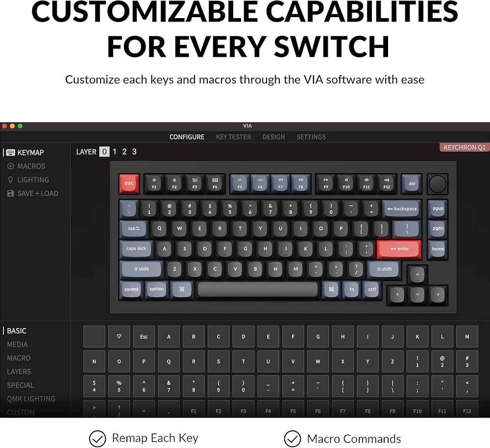 أغطية مفاتيح PBT مزدوجة اللقطة وإضاءة خلفية مواجهة للجنوب: يأتي Q1 مع ملف تعريف OSA الفريد الخاص بنا وأغطية مفاتيح PBT مزدوجة اللقطة التي تهدف إلى توفير إحساس أكثر راحة ودقة بأطراف الأصابع مع مقاومة ممتازة للزيت للاستخدام طويل الأمد. تم تصميم RGB المواجه للجنوب لإضاءة الإضاءة الخلفية للوحة المفاتيح بشكل أفضل من زاوية الكاتب وخالية من التداخل عندما يقوم المستخدم بتثبيت أغطية المفاتيح البديلة لملف Cherry-profile على Q1.
