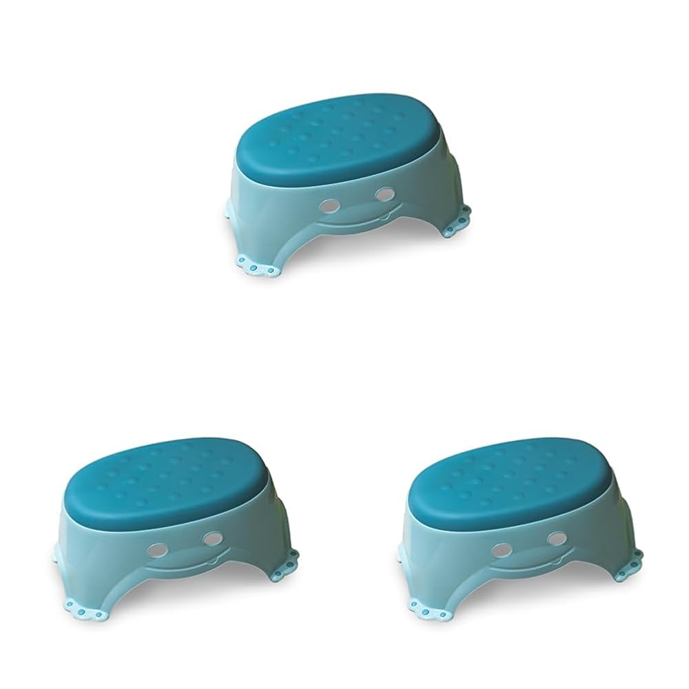 مقعد خطوات من Mommy's Helper - مقعد باللون الأزرق المخضر غير قابل للانزلاق مع وجه مبتسم لطيف، مقاس 14 × 8.5/6.5 بوصة، مثالي لغسل أيدي الأطفال وتنظيف الأسنان والتدريب على استخدام المرحاض (عبوة من 3 قطع)