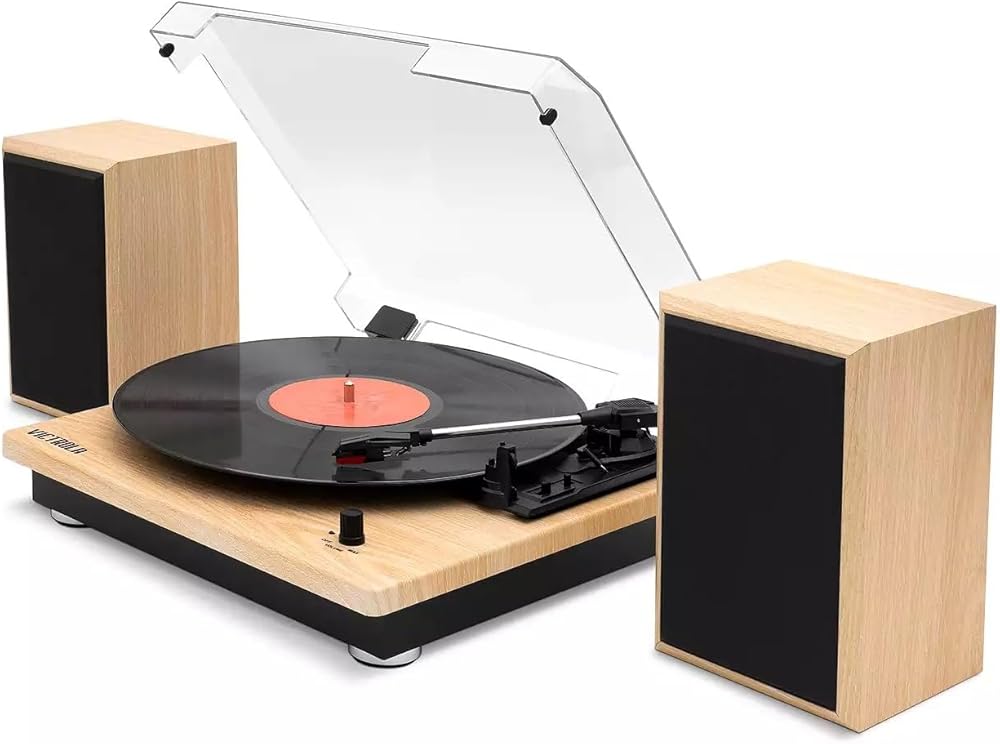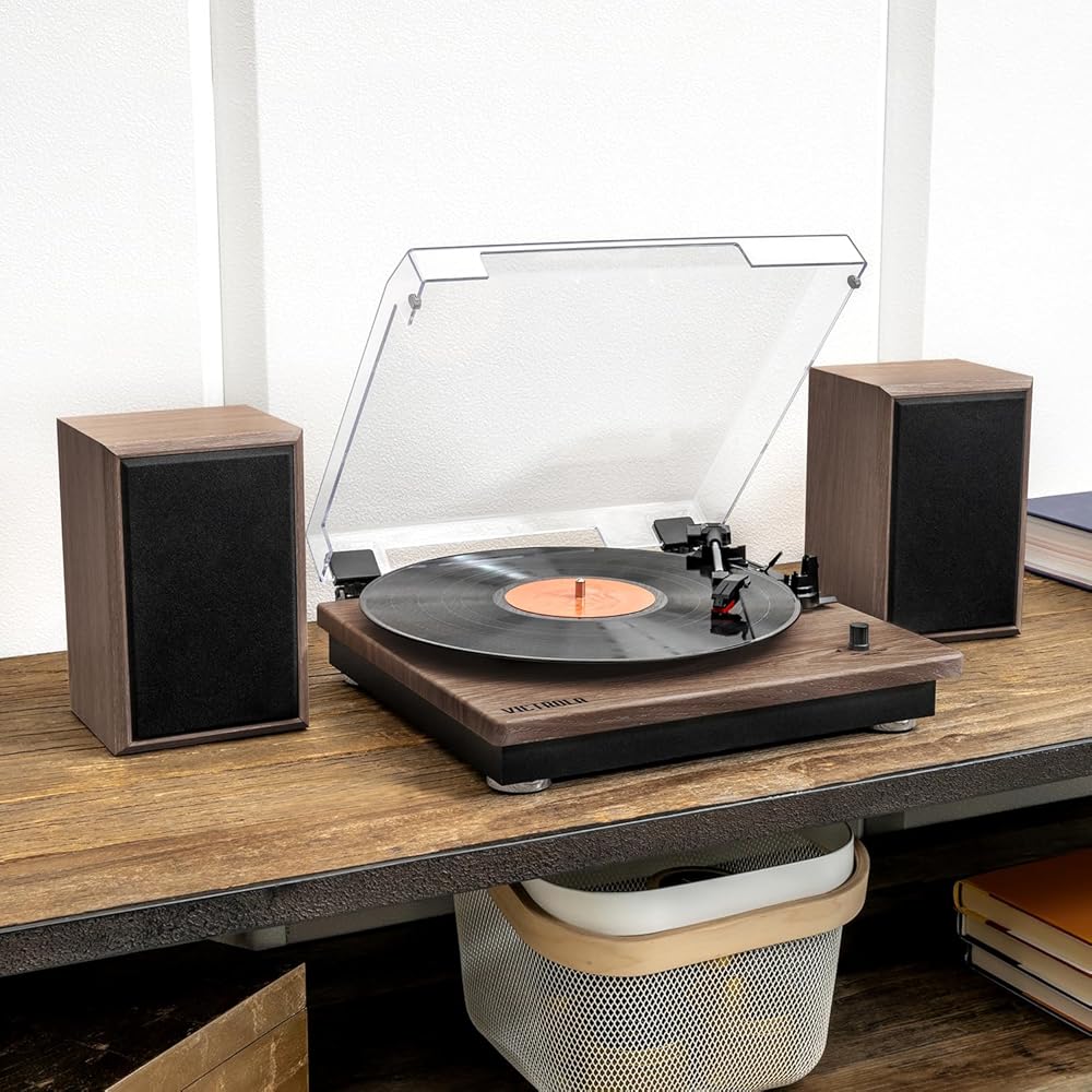 BELT-DRIVEN RECORD PLAYER - The 3-speed (33 1/3, 45, and 78 RPM) Victrola Montauk Vinyl Record Player easily connects with the included stereo speakers for wireless streaming of your favorite vinyl records, offering a true stereo listening experience