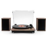 Classic Style And Modern Technology. Experience the timeless charm of music with the Victrola Montauk Turntable, a masterpiece of classical styling fused with modern functionality. Crafted with an elegant warm wood finish, this belt-driven record player brings your vinyl collection to life with its exceptional sound quality and minimal vibrations. Boasting three speeds (33 1/3, 45, and 78 RPM), it offers the versatility to play your cherished records in their original glory. Enhance your auditory journey with the matching stereo Bluetooth speakers, designed to complement the Victrola Record Player seamlessly. These 12-watt bookshelf speakers deliver rich, immersive sound wirelessly via Bluetooth, enabling you to stream music effortlessly from any smart device. Whether it's the nostalgic crackle of vinyl or your favorite digital tracks, these speakers ensure an enriching listening experience. Immerse yourself in a dynamic listening adventure tailored to your preferences. With RCA out and Bluetooth streaming capabilities, the Victrola Montauk Turntable effortlessly integrates into your entertainment system. Additionally, its 3.5mm aux-in headphone jack offers the option for private listening, perfect for those moments of personal musical indulgence. Combining aesthetics with functionality, this Bluetooth record player exudes sophistication with its sleek design, wood finish, and clear acrylic dust cover, making it a timeless addition to any entertainment setup.