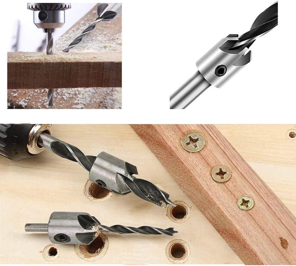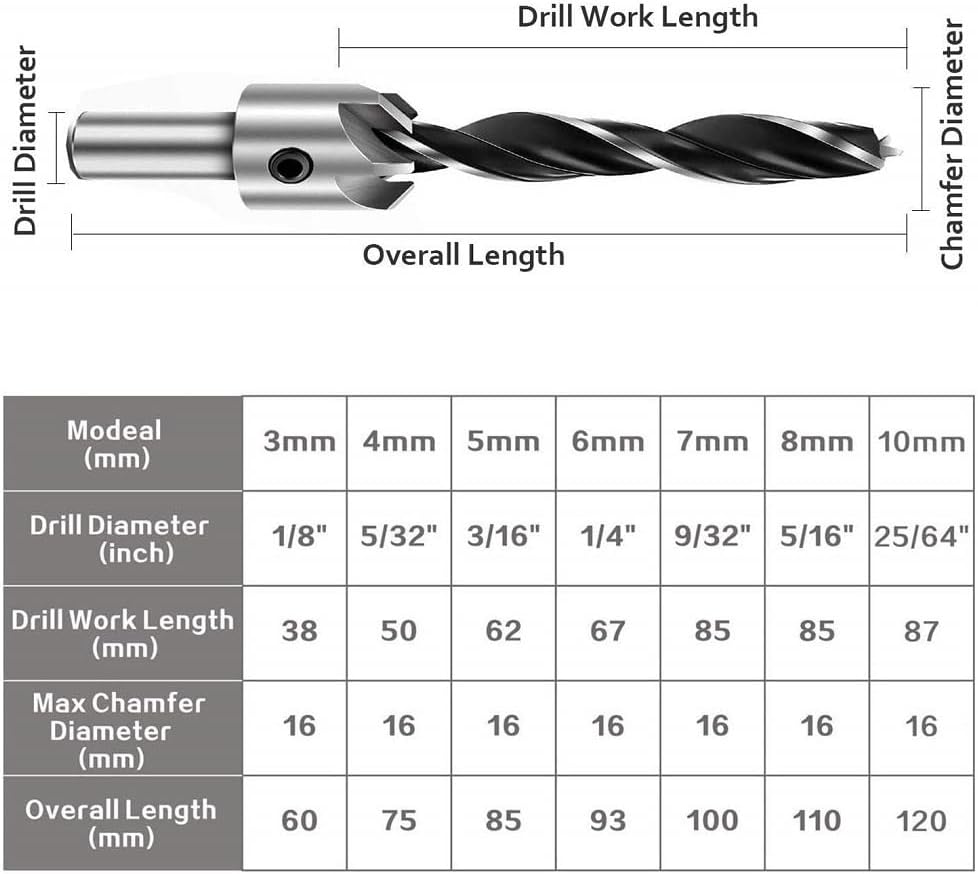 • 【Countersink Drill Bit Set】Countersink drill bits in 7 different sizes (3mm / 4mm / 5mm / 6mm / 7mm / 8mm / 10mm) with hex key wrench.