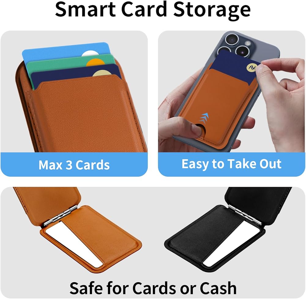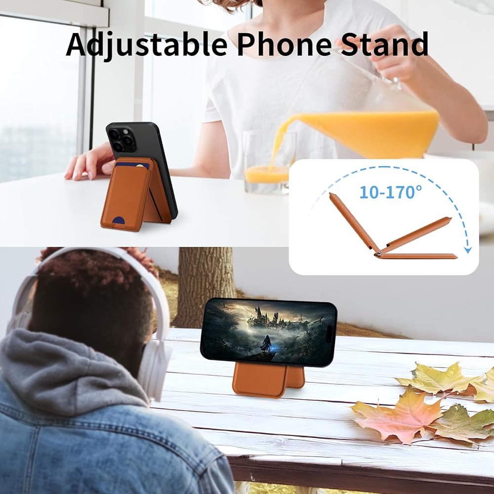 حامل المحفظة المغناطيسية القابلة للتعديل: تدعم محفظة الهاتف المغناطيسية 2 في 1 أي تعديل زاوية من 10 درجات إلى 170 درجة. تسمح المفصلة القوية والقابلة للتعديل بإنشاء محفظة magsafe كحامل للهاتف.