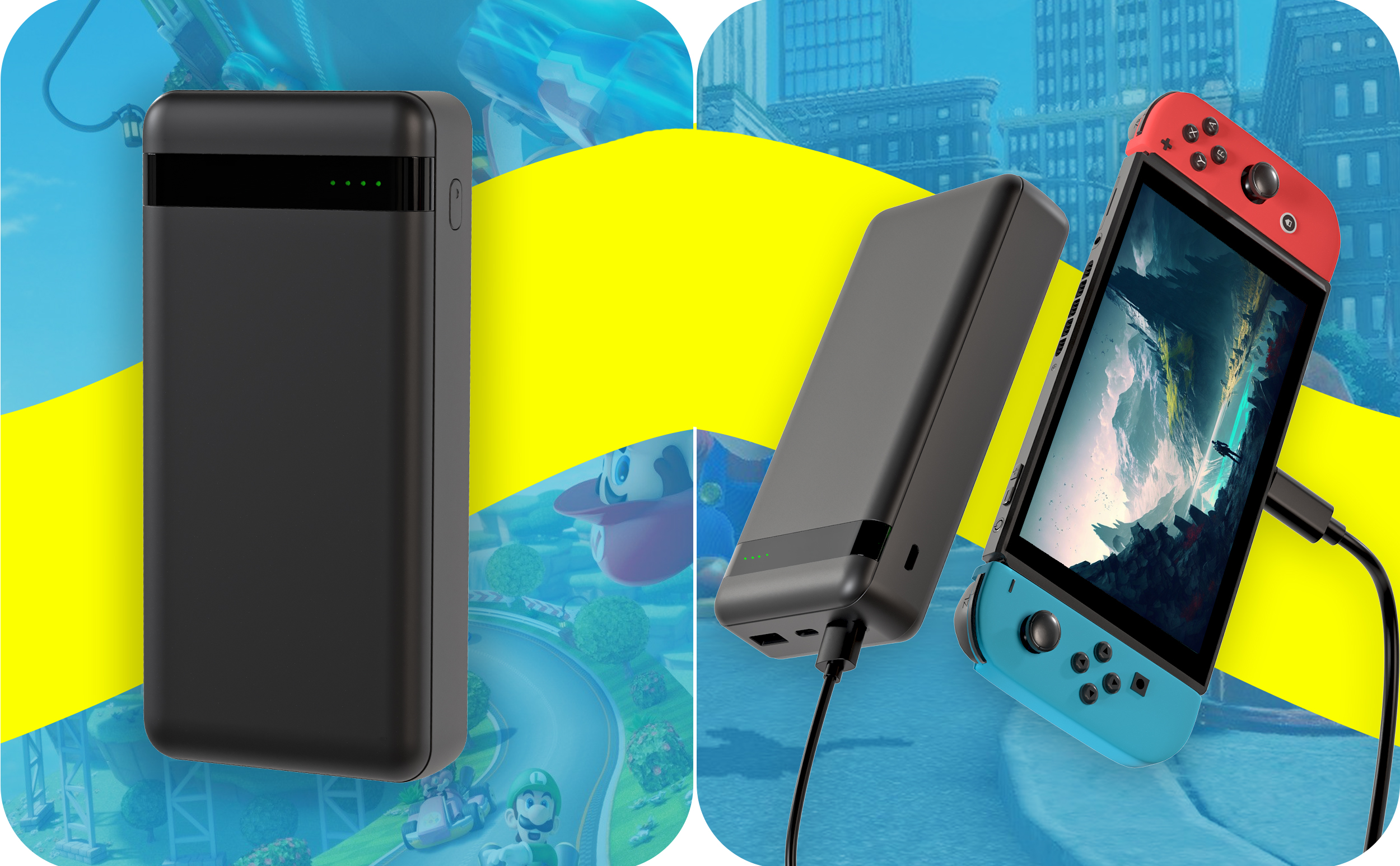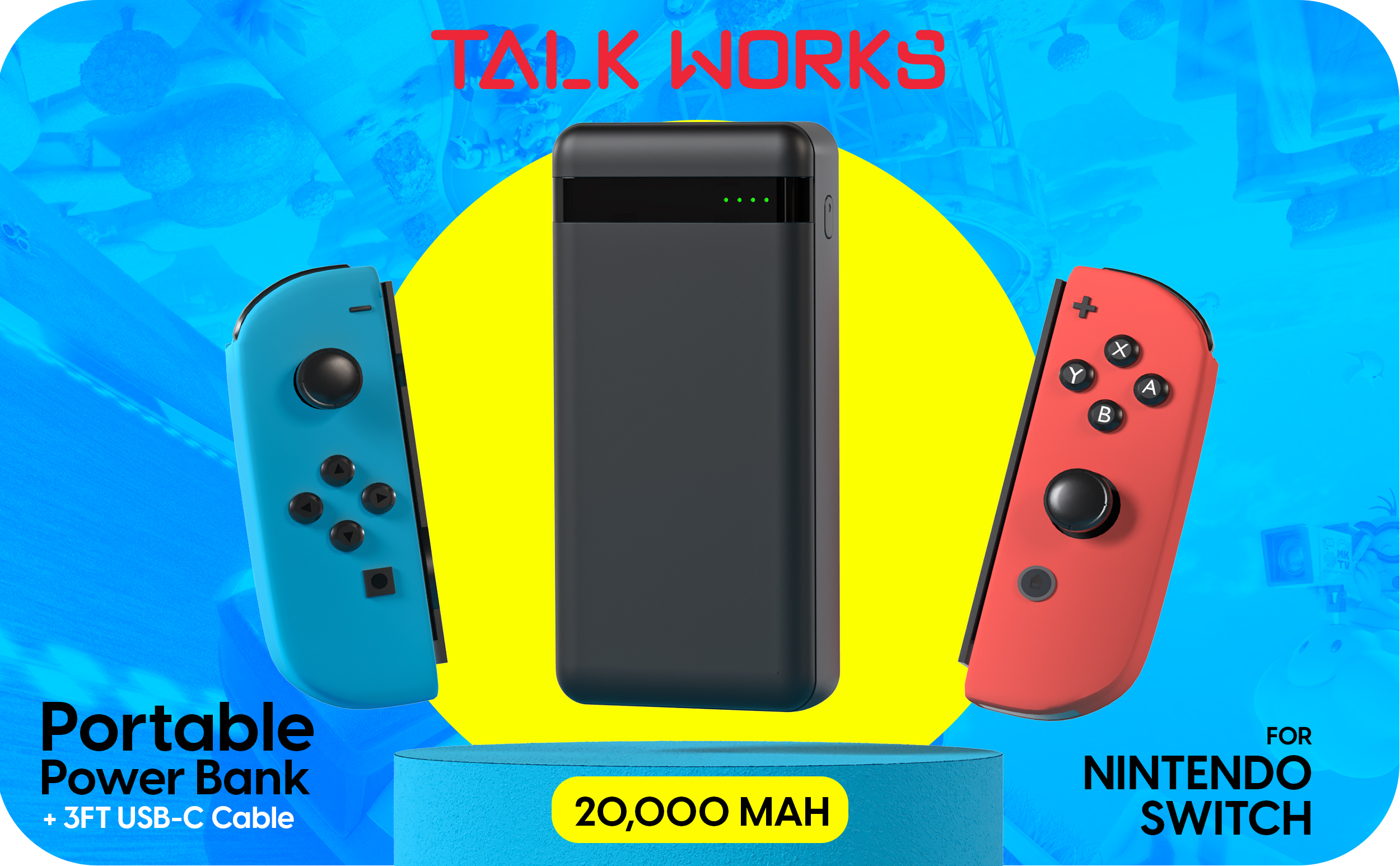 Portable Charge Power Bank; 20,000 mAh battery supplies a super fast charge to your Nintendo Switch consoles so you can spend less time charging and more time having fun gaming