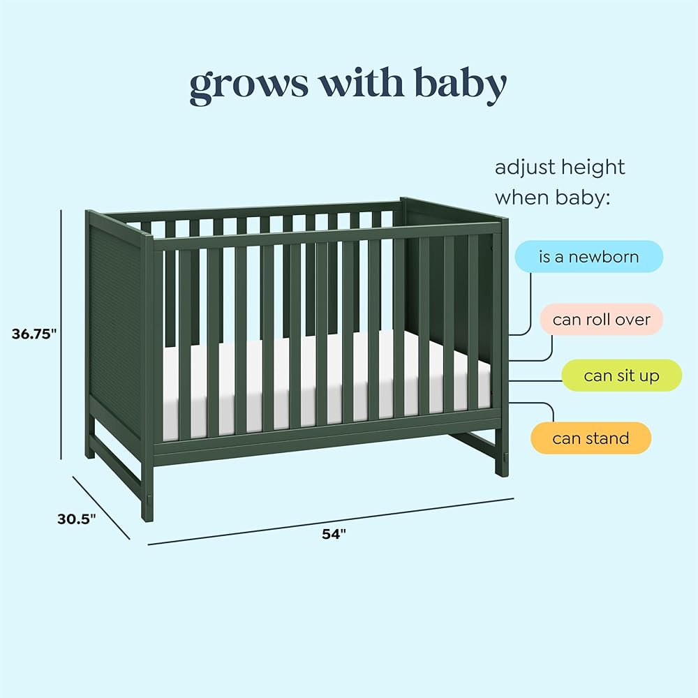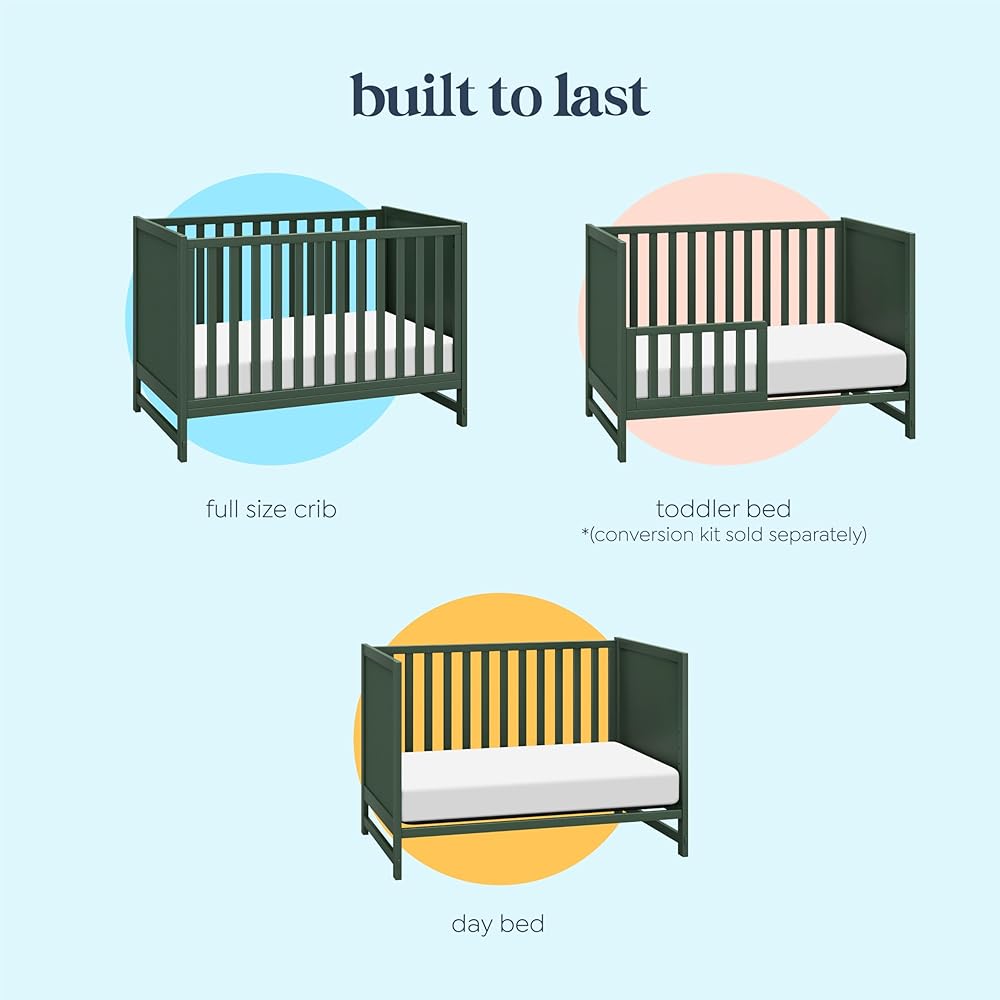 GROWS WITH BABY: Four adjustable mattress positions that can be lowered as your baby grows. Easily converts to toddler bed, and daybed. (toddler bed conversion kit #M12599 sold separately)