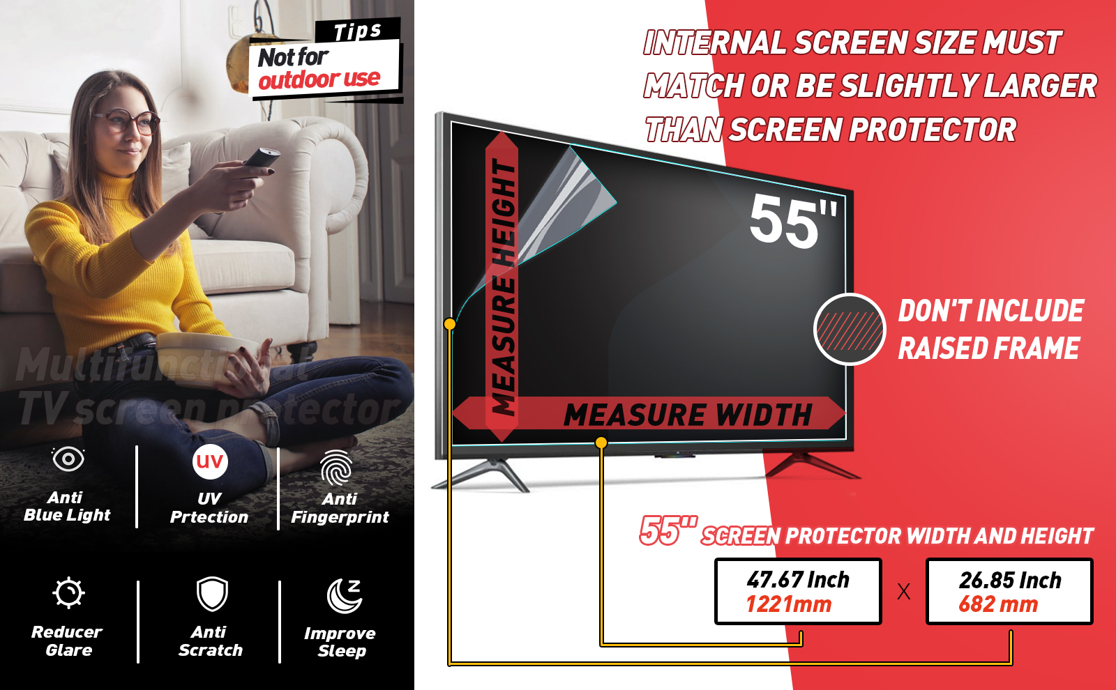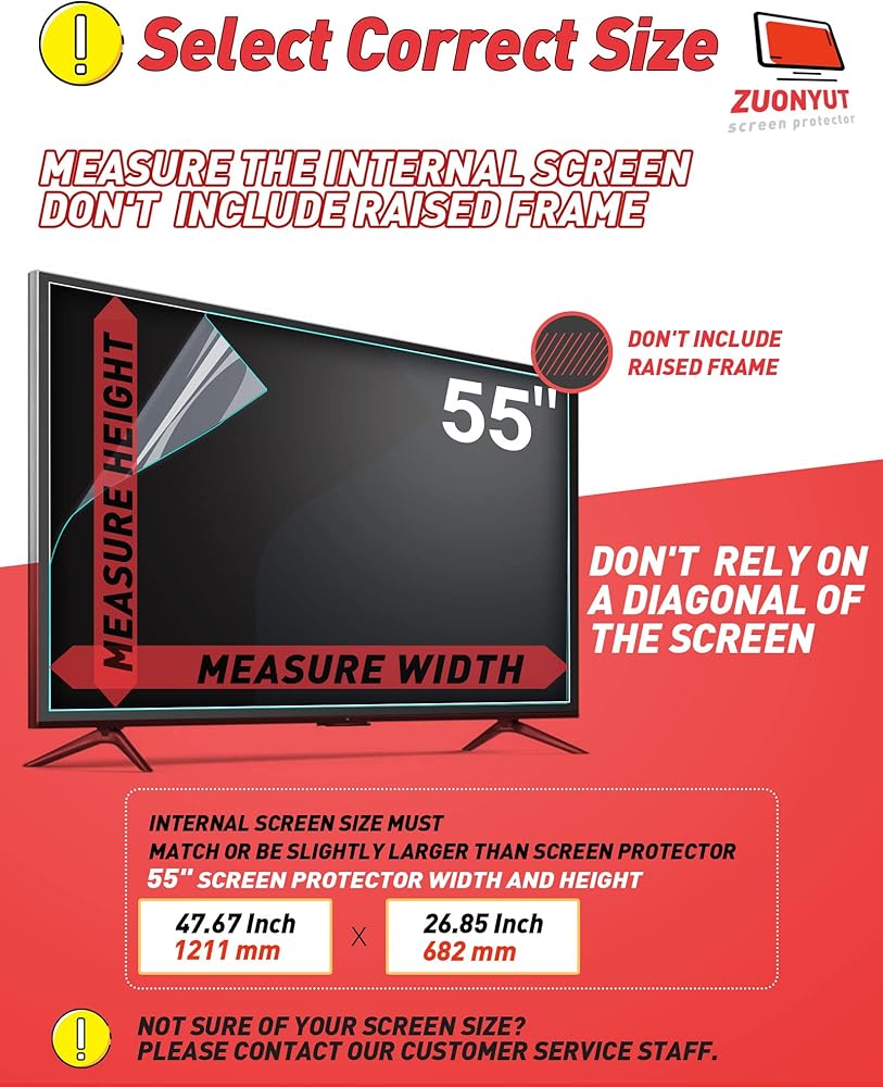 • حجم طبقة وهج الشاشة 55 بوصة: الحجم الفعلي W47.67in H26.85in/W1211mm H682mm، يرجى القياس والمقارنة بجدول المقاسات قبل الشراء، يجب أن يتطابق حجم الغشاء الواقي مع الشاشة الداخلية، وبعض أجهزة التلفاز مقاس 55 بوصة بدون حواف ليست كذلك ملائم