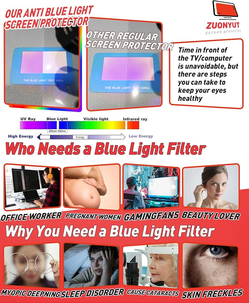 • يتمتع فيلم ZUONYUT بأداء ممتاز في مقاومة التوهج والضوء الأزرق والخدوش، وهو مثالي لحماية شاشة التلفزيون الخاصة بك! لا مفر من قضاء الوقت أمام التلفاز/الكمبيوتر، ولكن هناك خطوات يمكنك اتخاذها للحفاظ على صحة عينيك