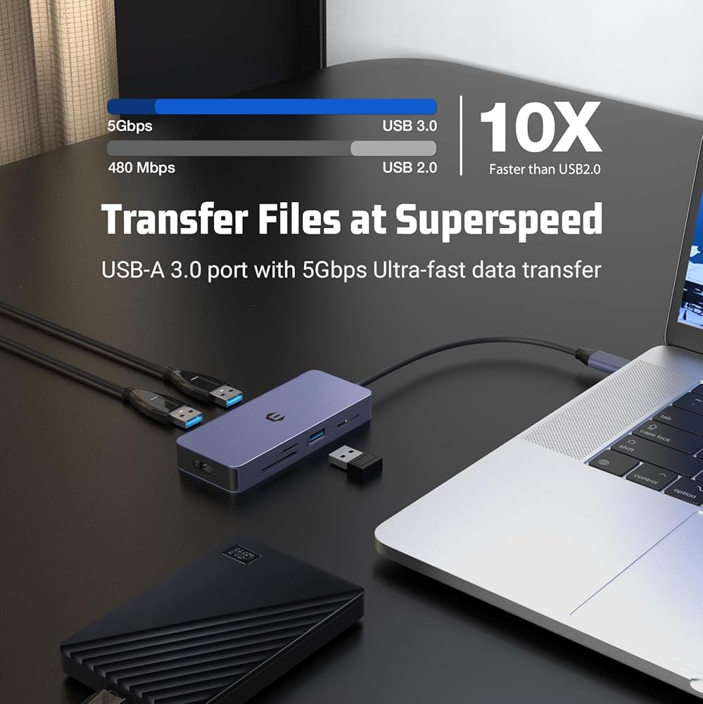 USB C Card Reader: The USB hub built-in SD/TF dock provides easy access to your memory card, transferring hundreds of photos to your laptop in seconds with a top speed of 104MB/s and no additional card reader or adapter required.