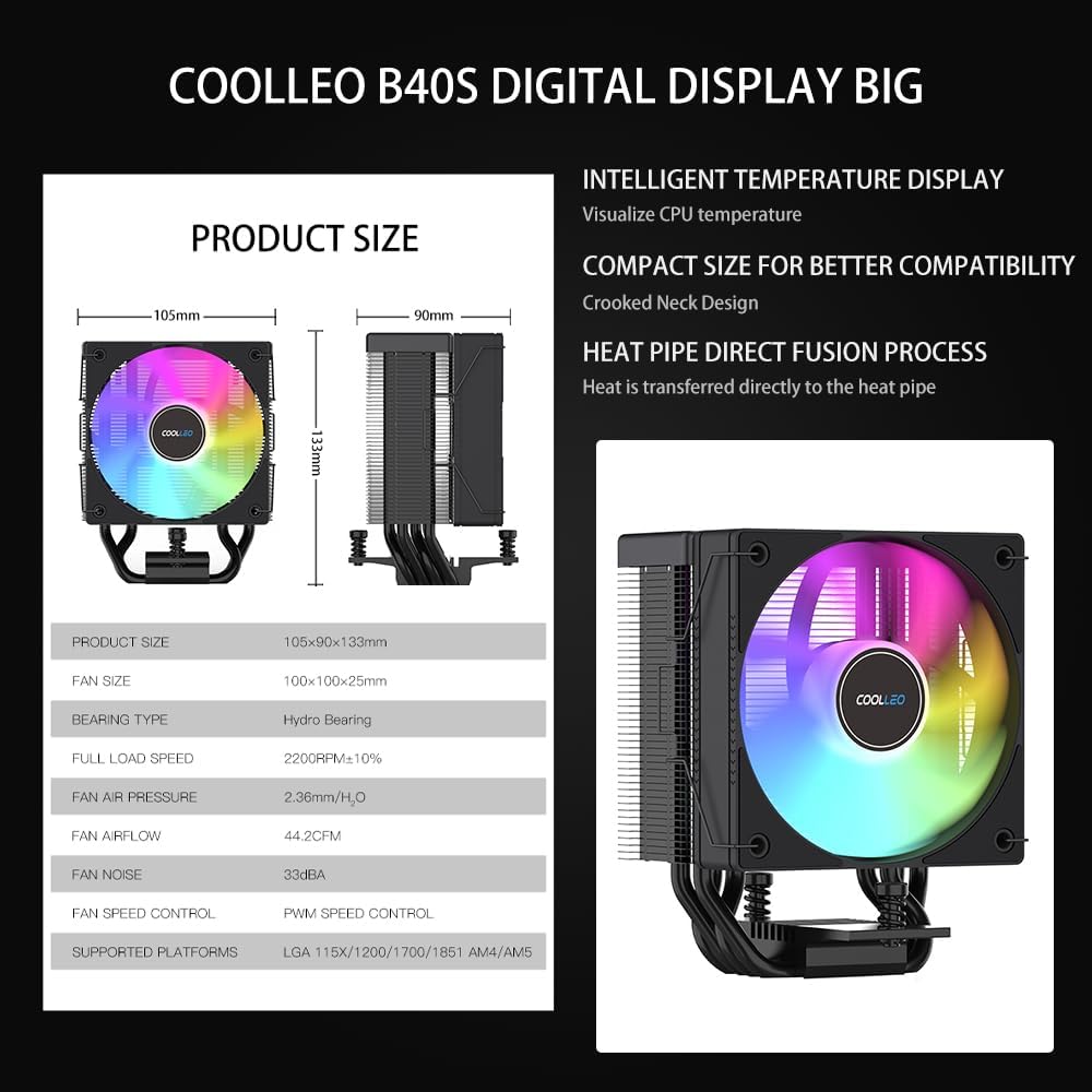 【تبريد متوافق متعدد المنصات】: فتحة مبرد هواء وحدة المعالجة المركزية الرقمية B40S ARGB تدعم منصات Intel 115X/1200/1700/1851 وAMD AM4/AM5، حجم مبرد وحدة المعالجة المركزية 105 (طول)*90(عرض)*133(ارتفاع) مم حجم صغير لتوافق أفضل وتبديد فعال للحرارة.