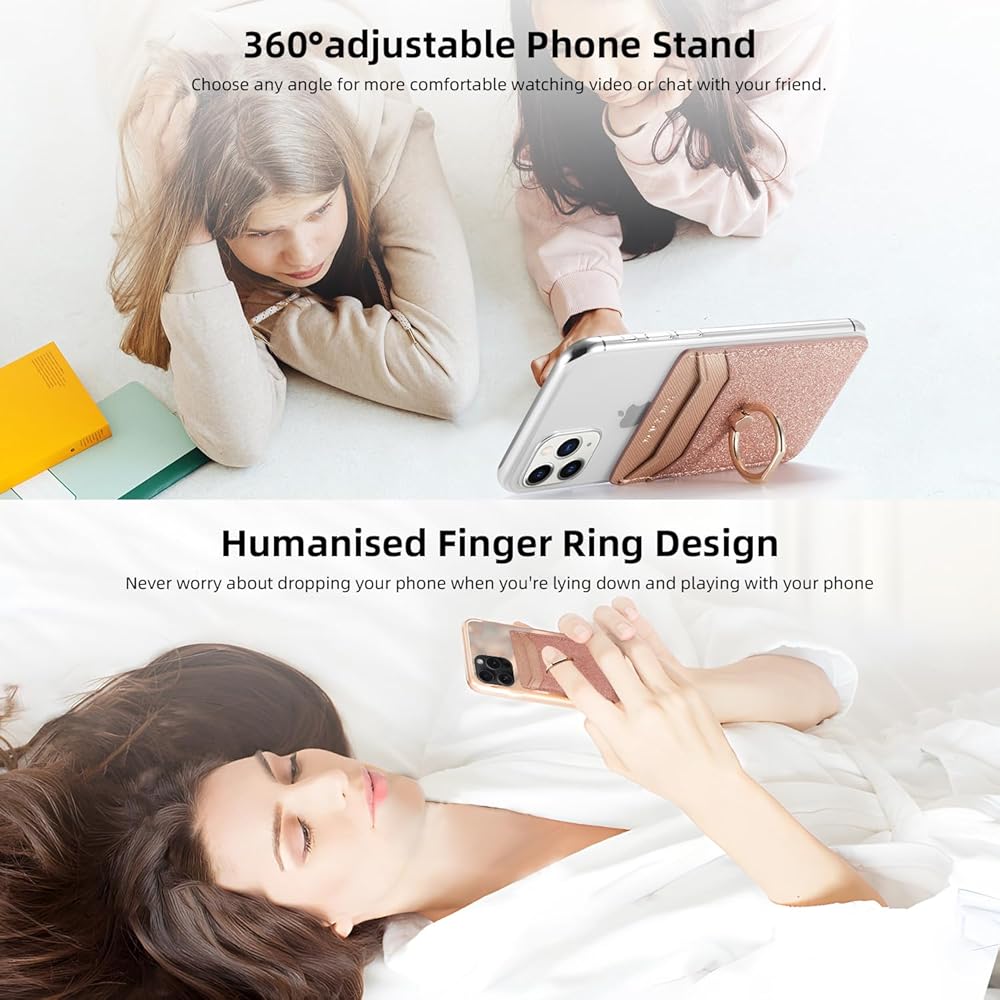 • 360 swivel ring on back : you can put your finger through this ring and have more stability and comfortable when you're holding your phone,and no worry about sag or pulled at the cards. It also helps to prop your phone up in a slew of different ways, great for standing up the phone when taking pictures with the timer also watching video.