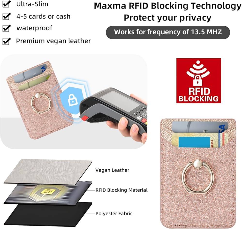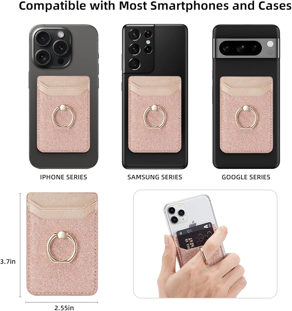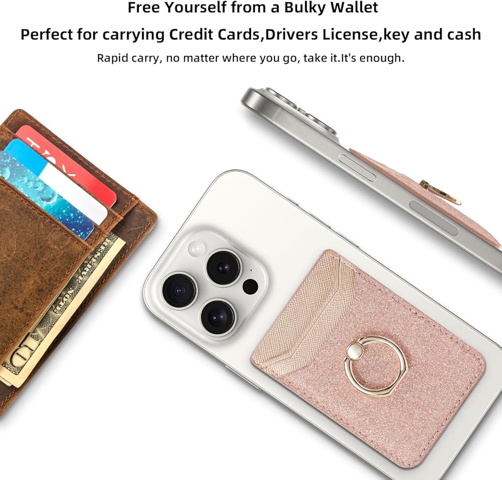 حامل بطاقة الائتمان لحافظة الهاتف، مرفق محفظة لاصقة RFID لحافظة الهاتف مع حامل حلقة الإصبع على معظم الهواتف الذكية لهواتف iPhone وGalaxy وGoogle، جلد نباتي - وردي لامع