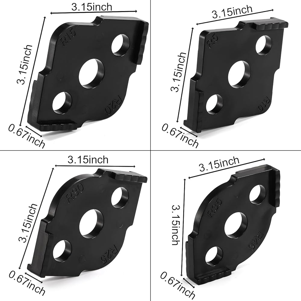 8 أنصاف زوايا مختلفة الحجم: مجموعة من 4 قوالب توجيه نصف قطر، توفر 8 أنواع مختلفة من الزوايا لتستخدمها، بما في ذلك R5 R10 R15 R20 R25 R30 R35 R40. كل حجم نصف قطر محفور بشكل واضح على القالب، مما يسمح بسهولة اختيار حجم الانحناء المطلوب