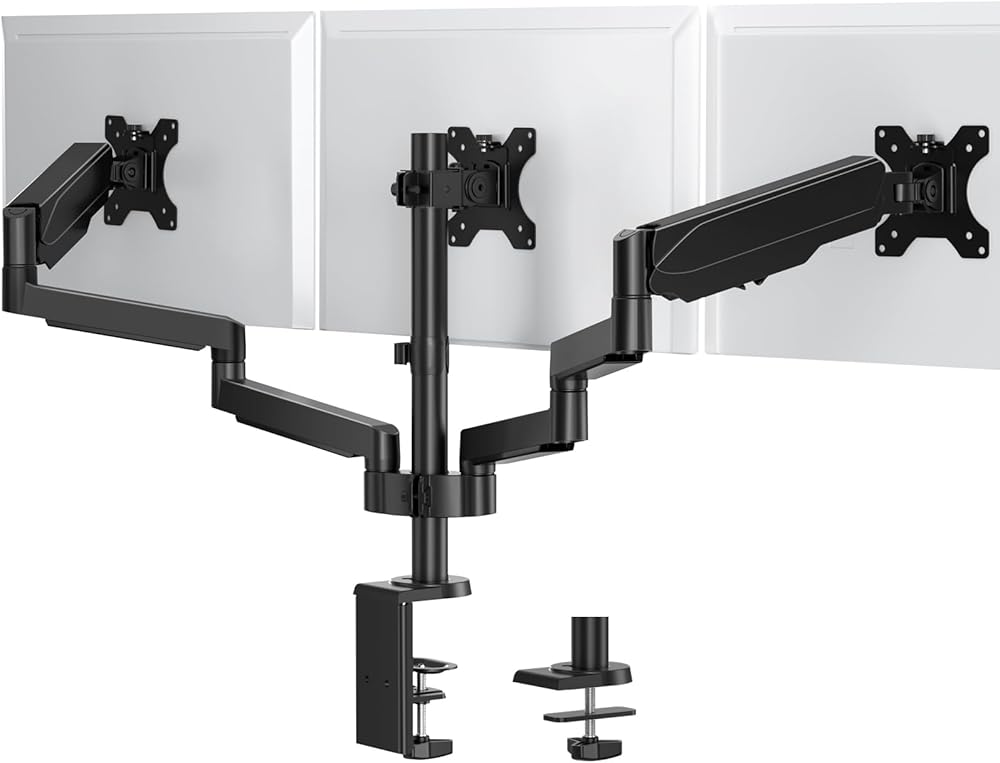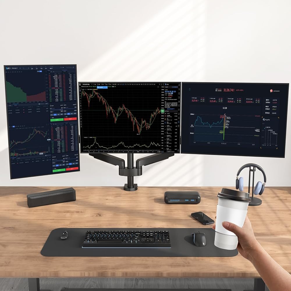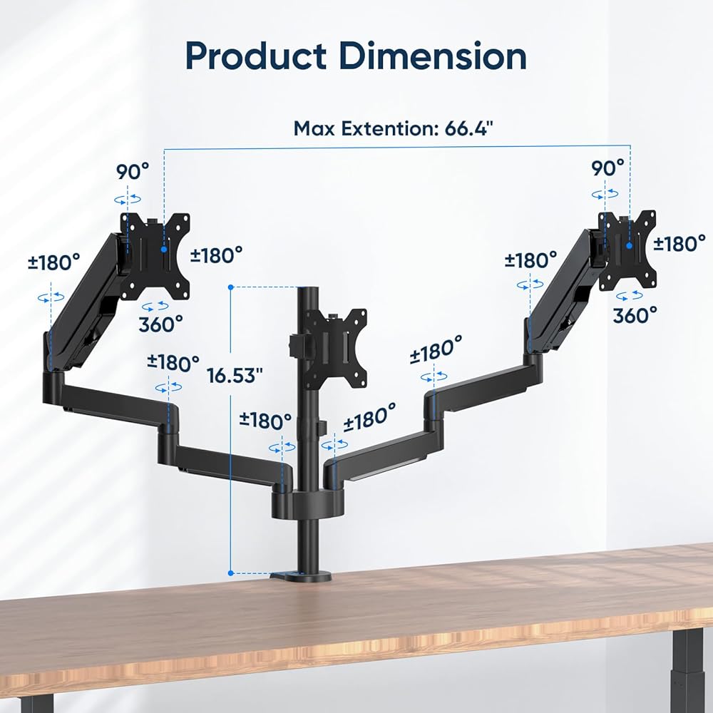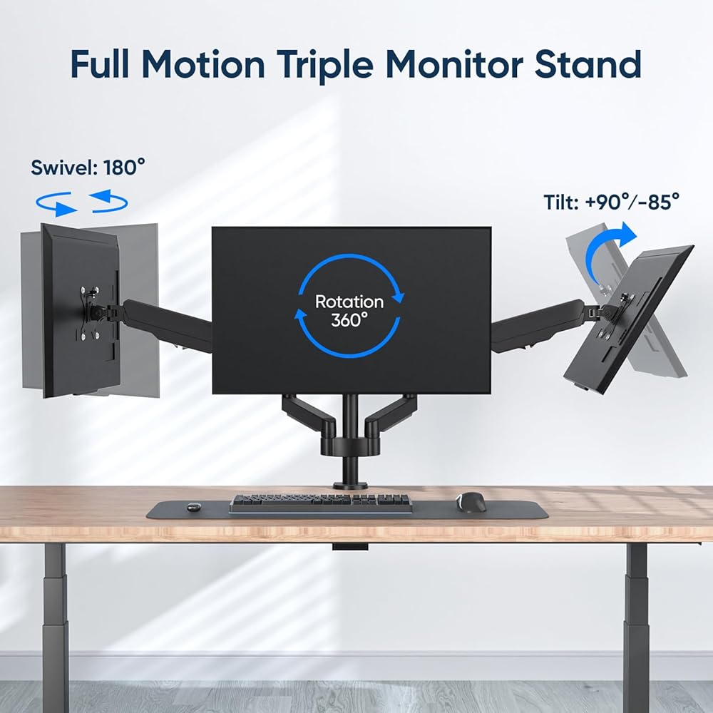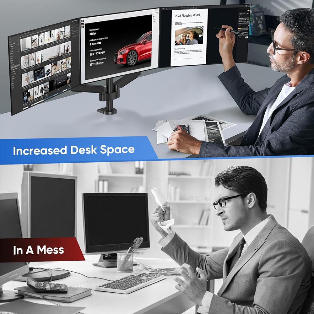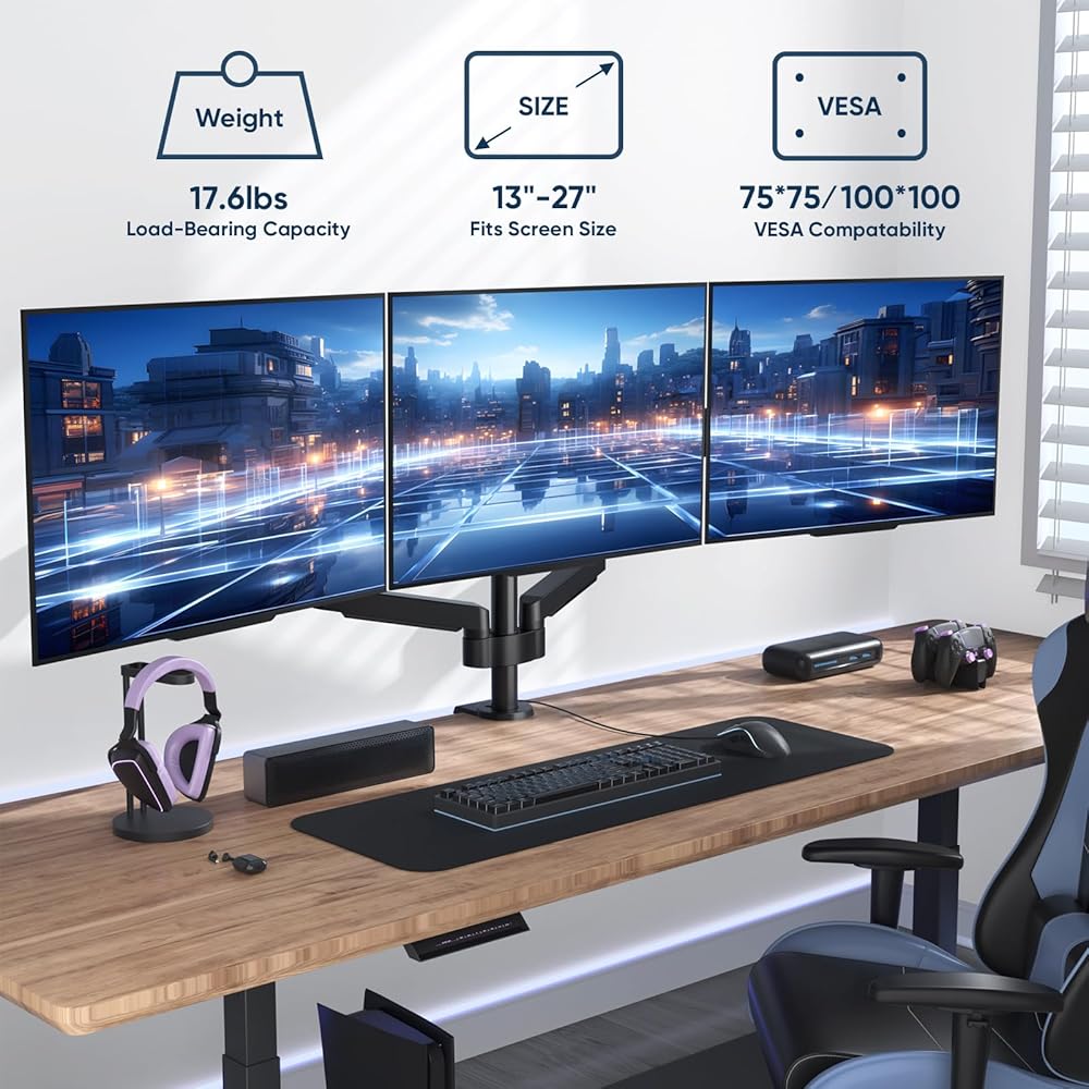 • حامل مكتبي ثلاثي للكمبيوتر: تم تصميم حامل المكتب الثلاثي للشاشة ليناسب معظم الشاشات التي يتراوح حجمها من 17 إلى 32 بوصة، ويصل وزن كل منها إلى 17.6 رطل. يتميز بفتحات تثبيت VESA مقاس 75 × 75 مم و100 × 100 مم، مما يضمن توافقًا متعدد الاستخدامات لشاشاتك
