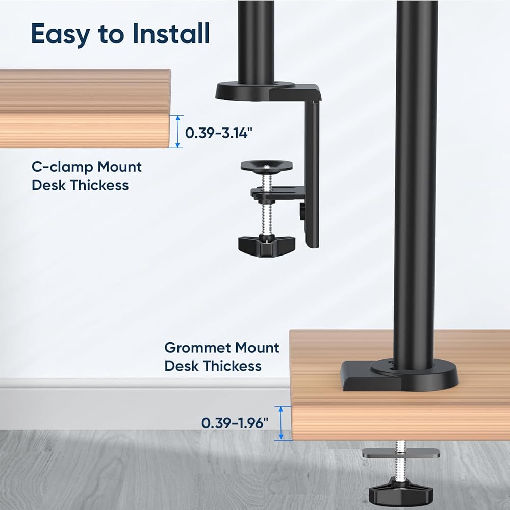 • خياران للتثبيت: تضمن القاعدة الموسعة والهيكل القوي ثباتًا ممتازًا. يمكن تركيب حامل الشاشة عالي التحمل باستخدام مشبك C أو حلقة تثبيت على المكاتب. المشبك على شكل حرف C يناسب سُمك المكتب 0.39-3.14 بوصة، حامل بحلقة معدنية يناسب سُمك المكتب 0.39-2.95 بوصة، يمكنك اختيار التركيب المناسب